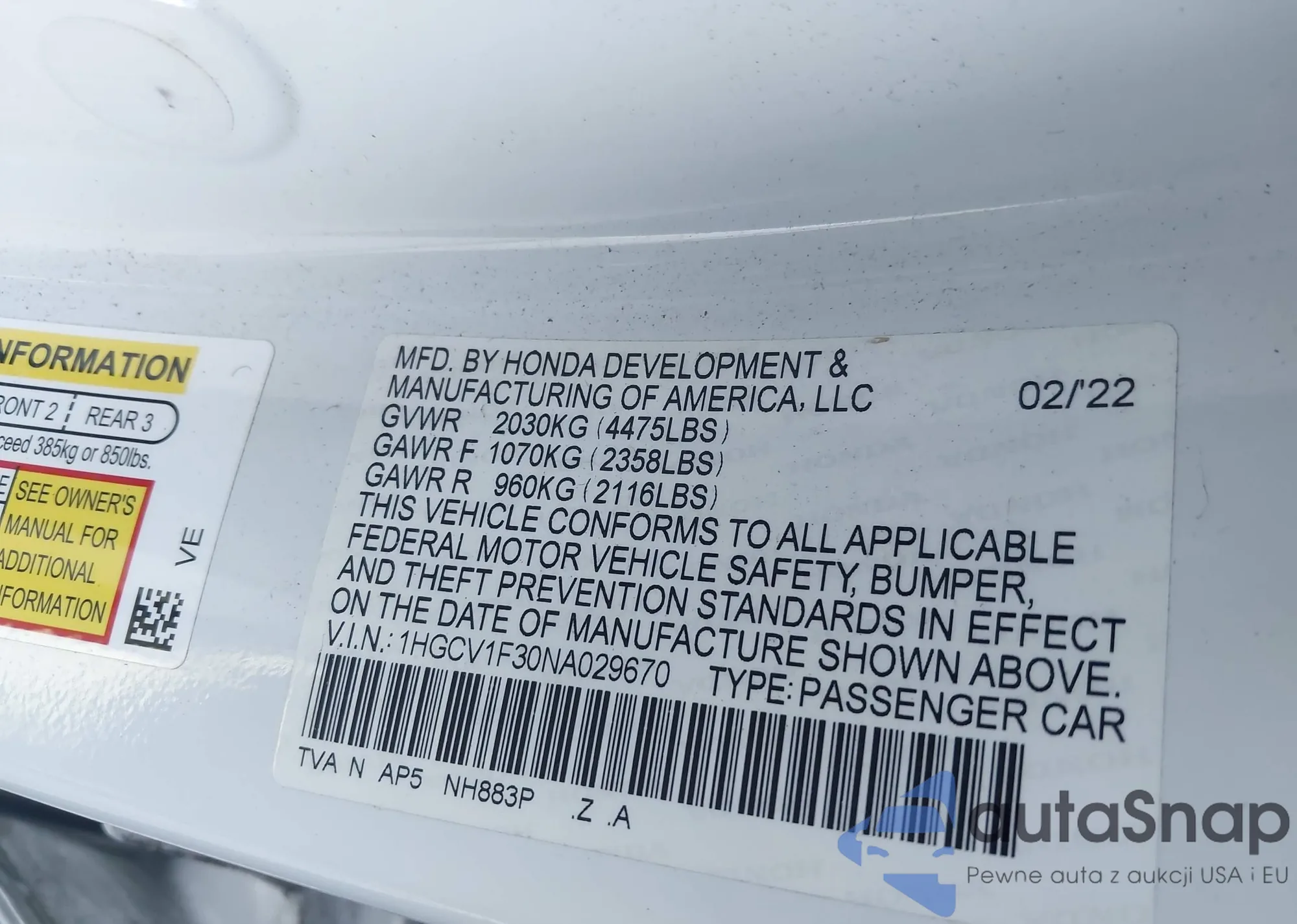 LOT: 44035332 VIN: 1HGCV2F94NA002675