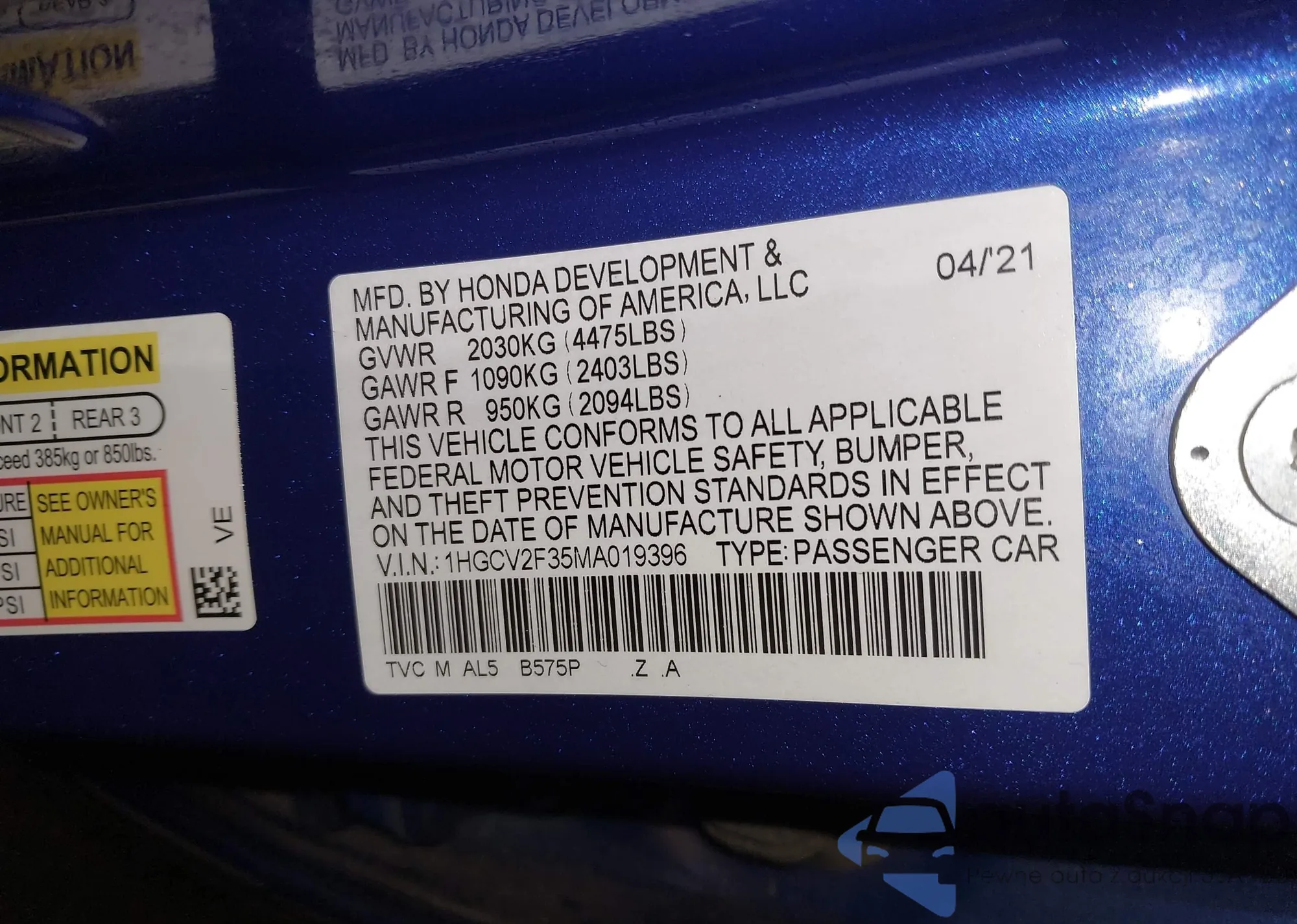 • VIN 1HGCV2F35MA019396