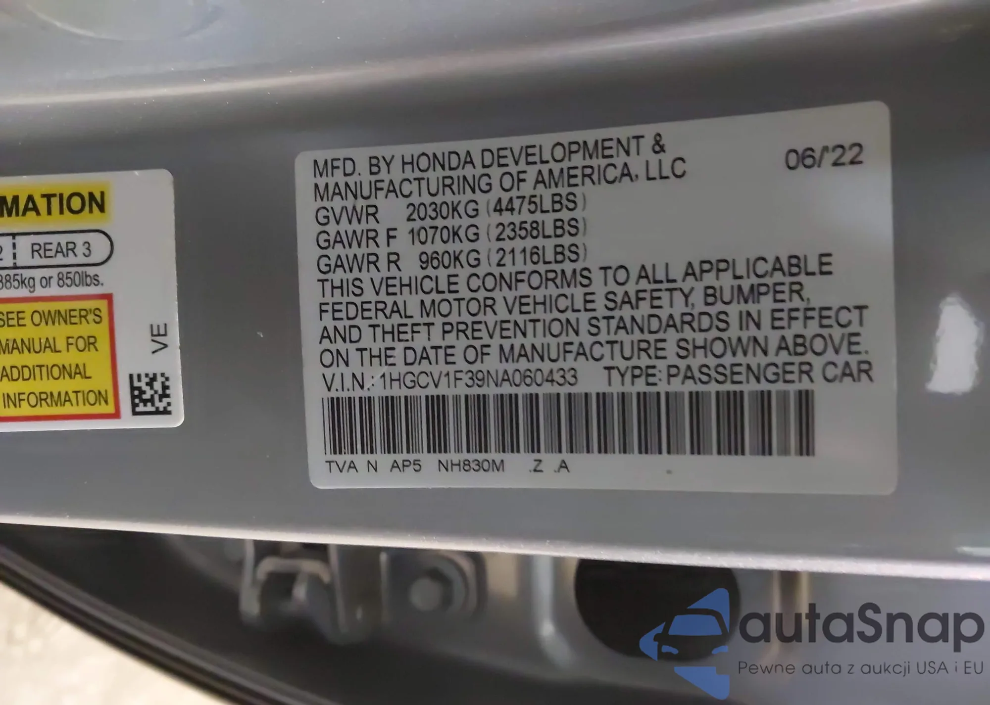 • VIN 1HGCV1F39NA060433