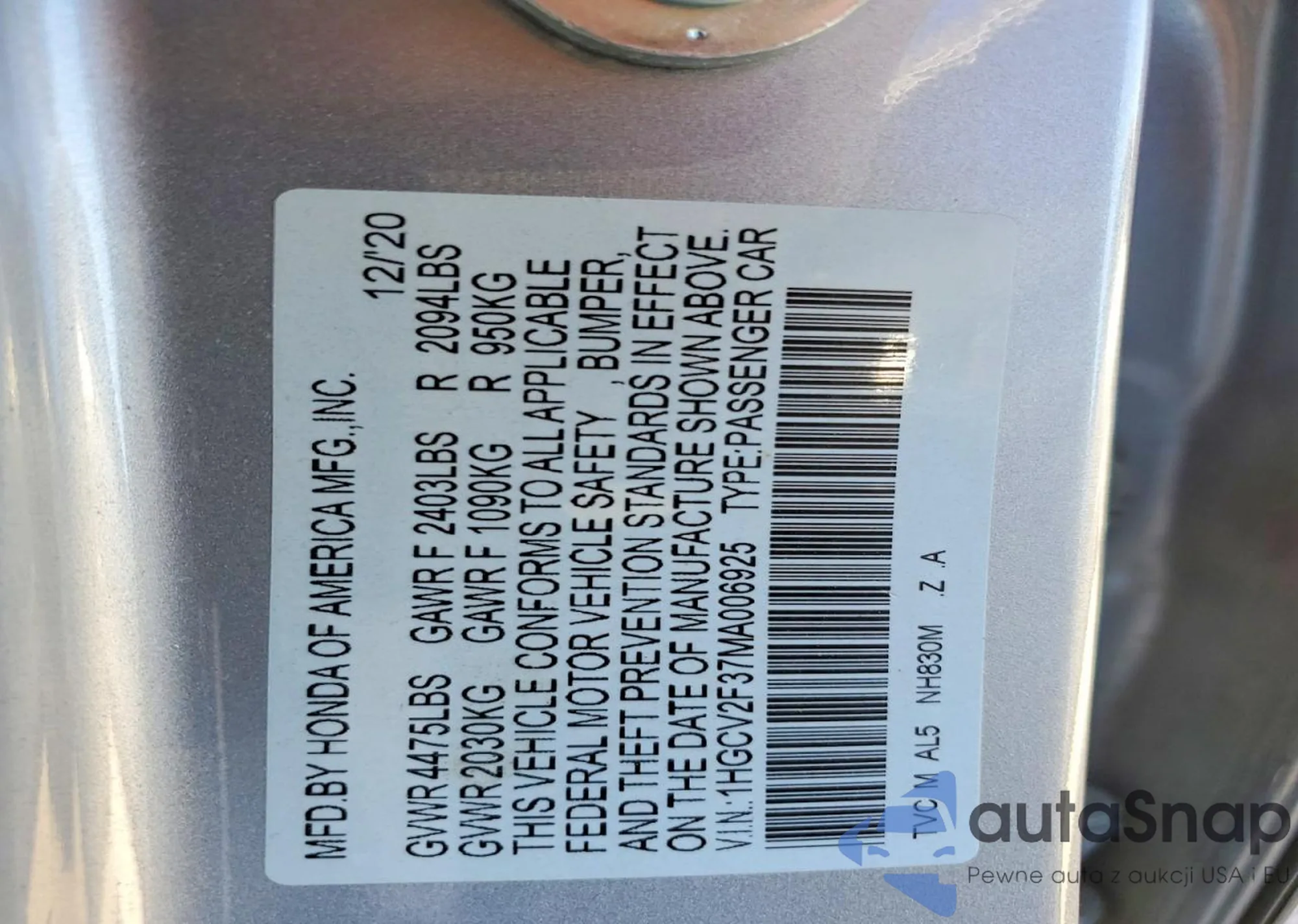 • VIN 1HGCV2F37MA006925