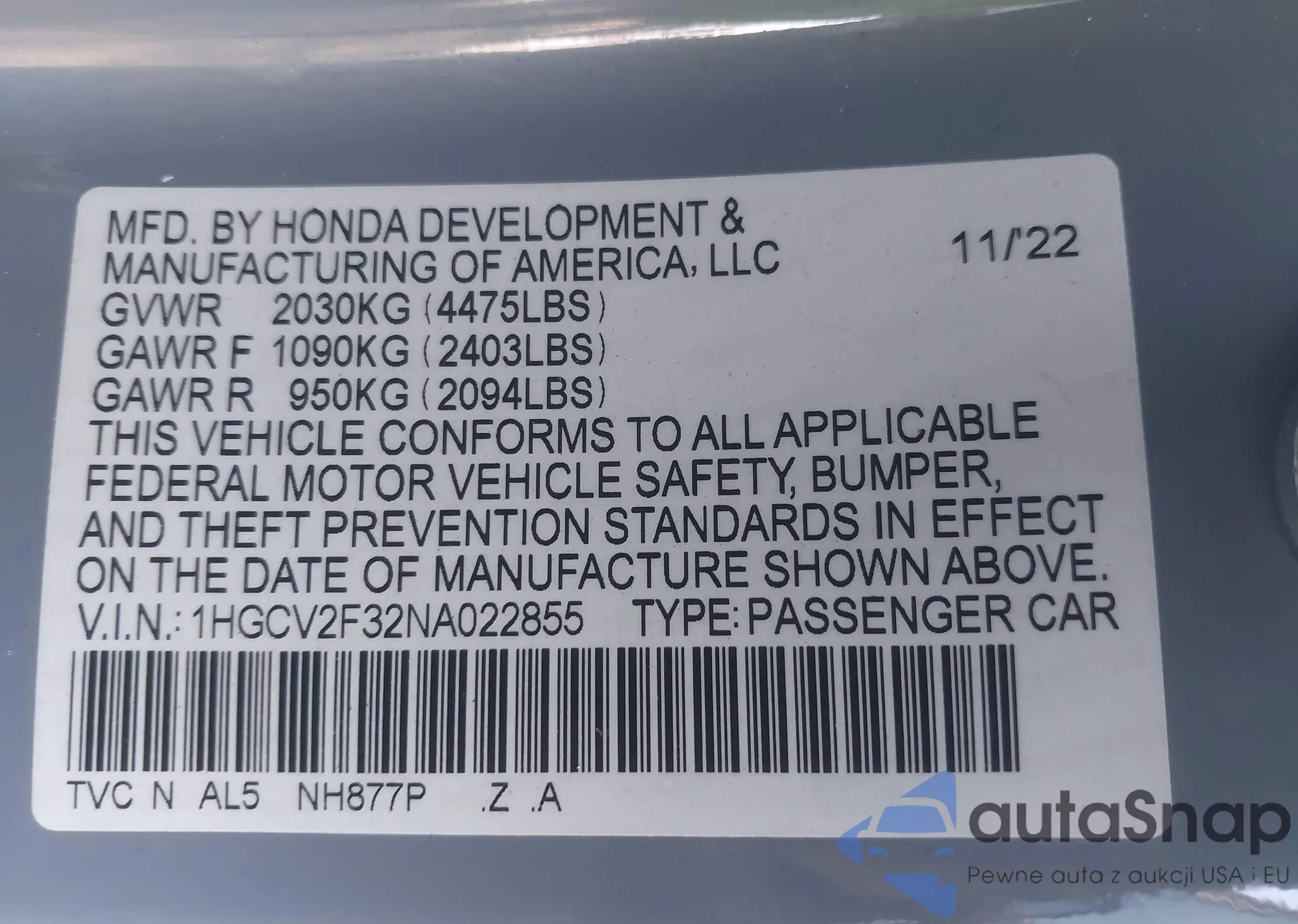 LOT: 44110674 VIN: 1HGCV2F32NA022855