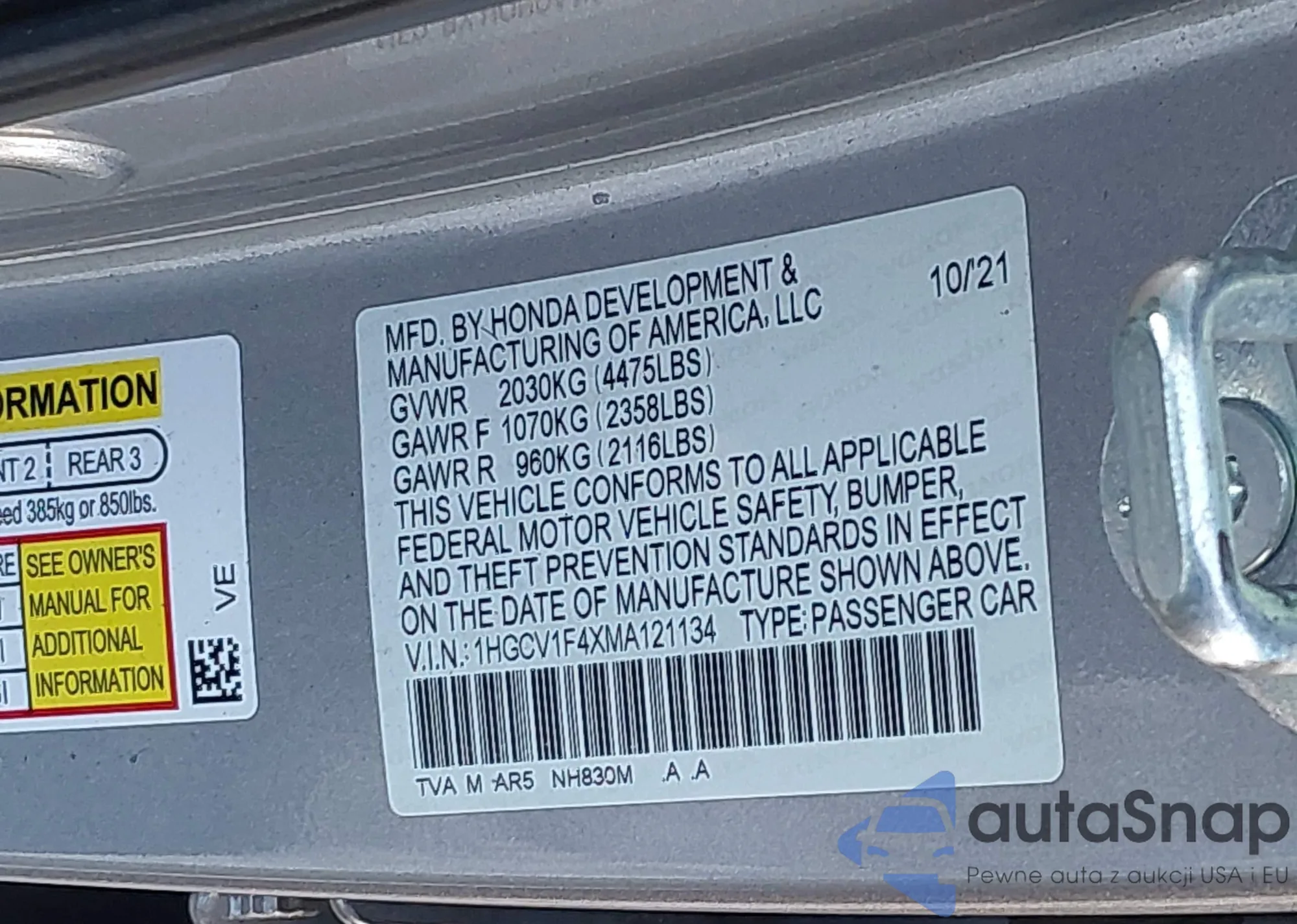 LOT: 44191866 VIN: 1HGCV1F32MA070493