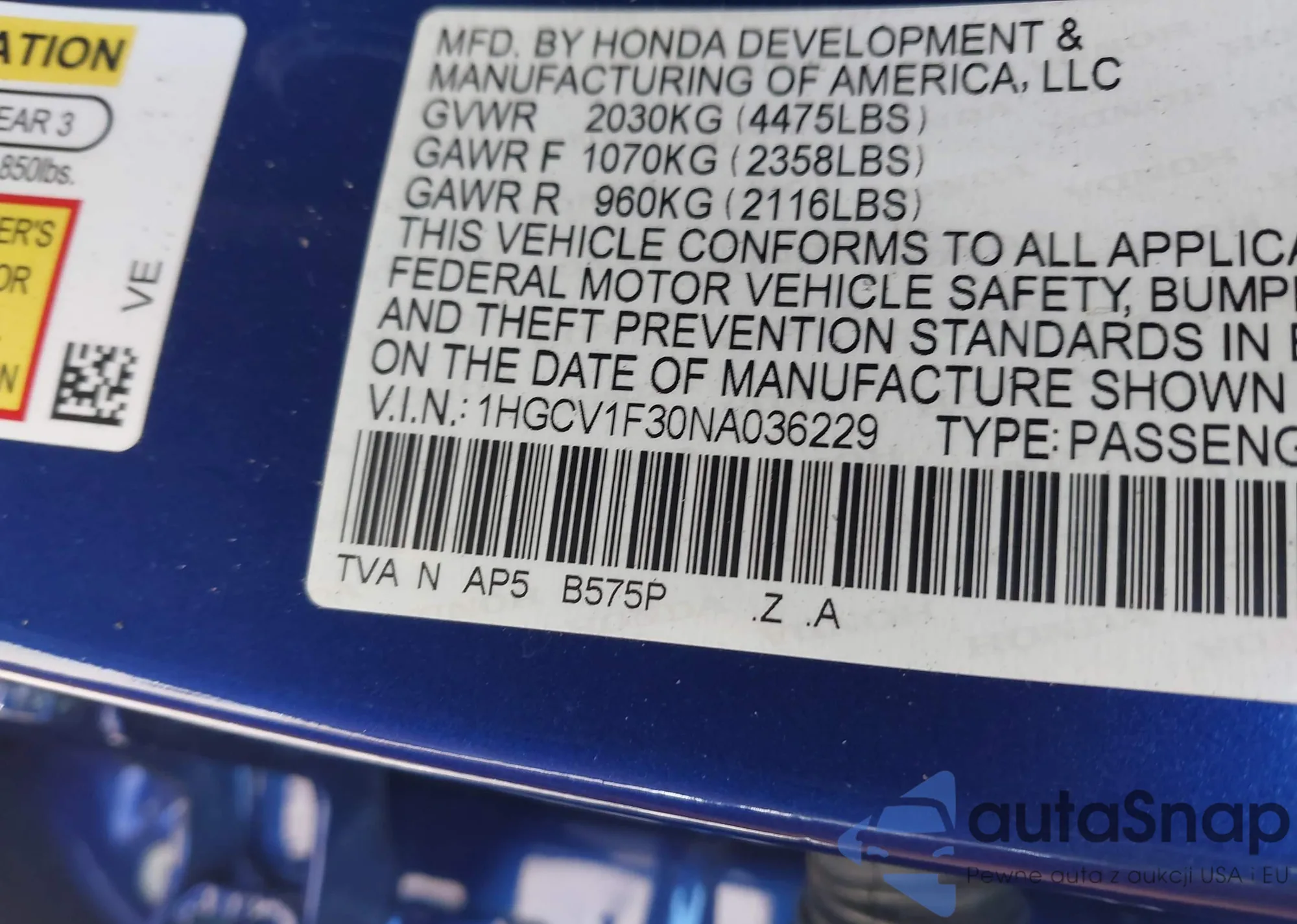 • VIN 1HGCV1F30NA036229