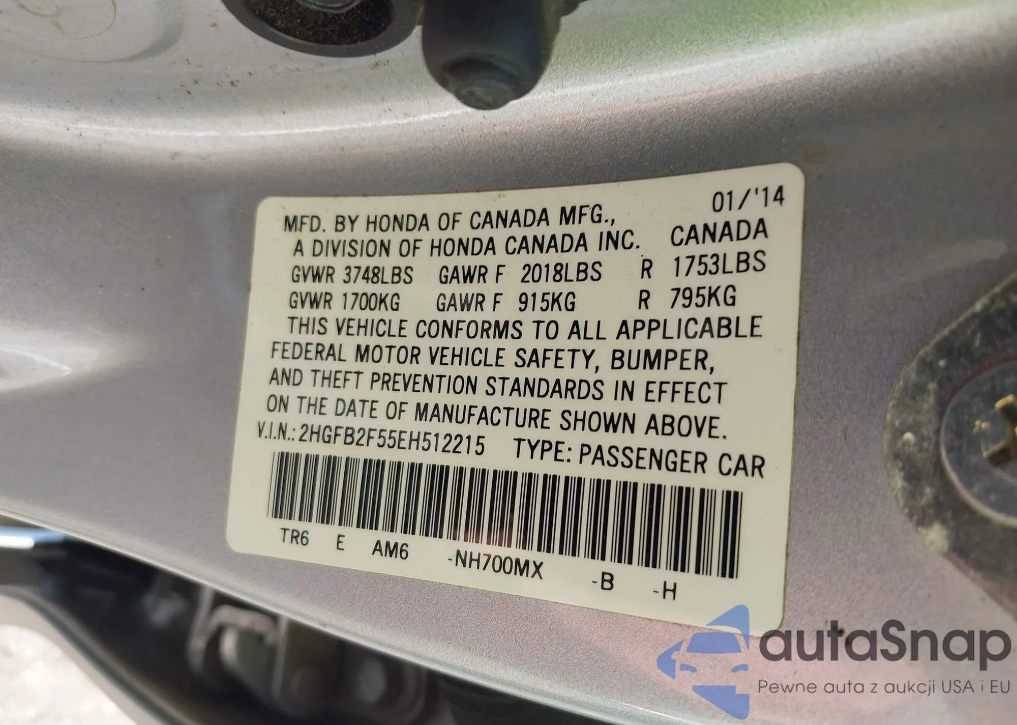 LOT: 43014064 VIN: 2HGFB2F55EH512215