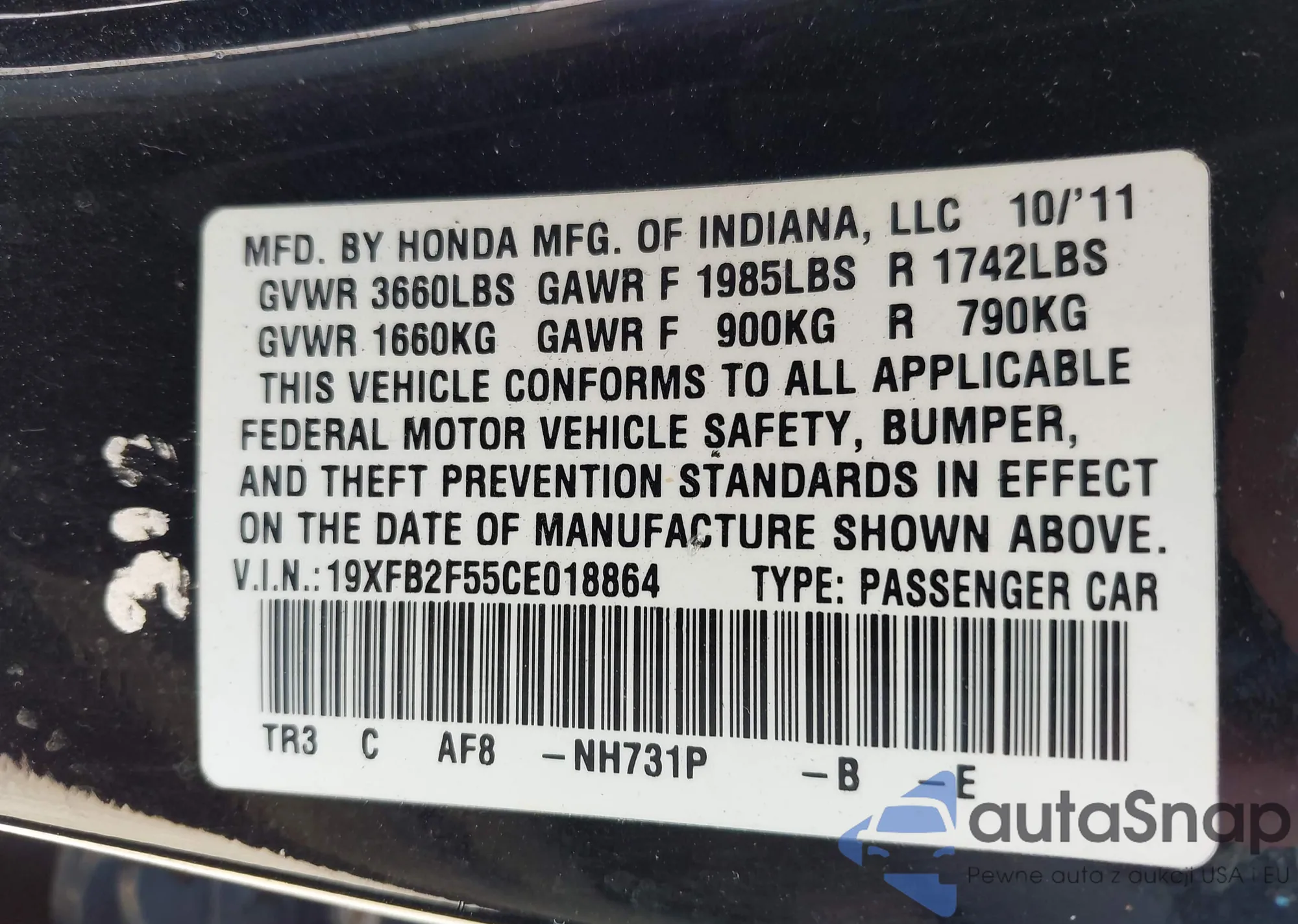 LOT: 43451212 VIN: 19XFB2F55CE018864