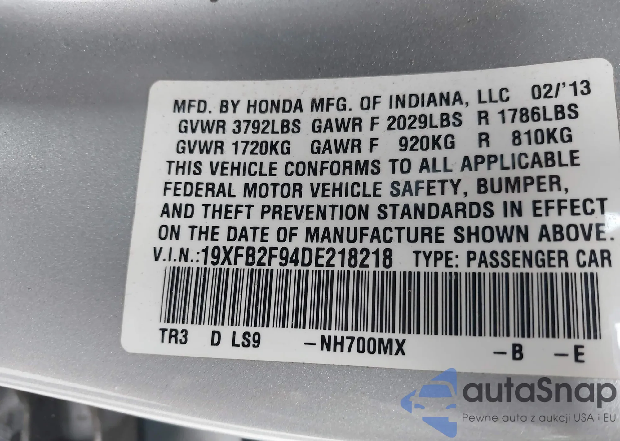 • VIN 19XFB2F94DE218218