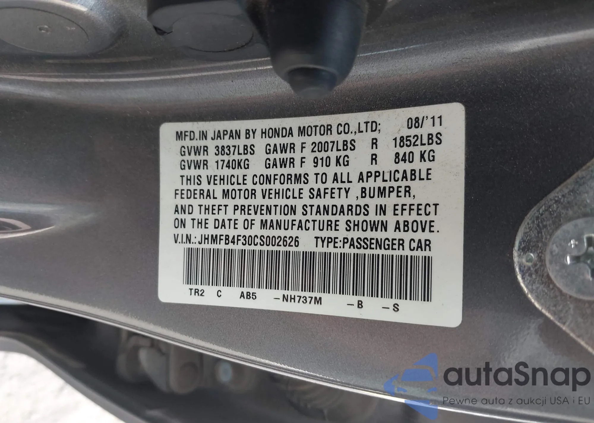 • VIN JHMFB4F30CS002626