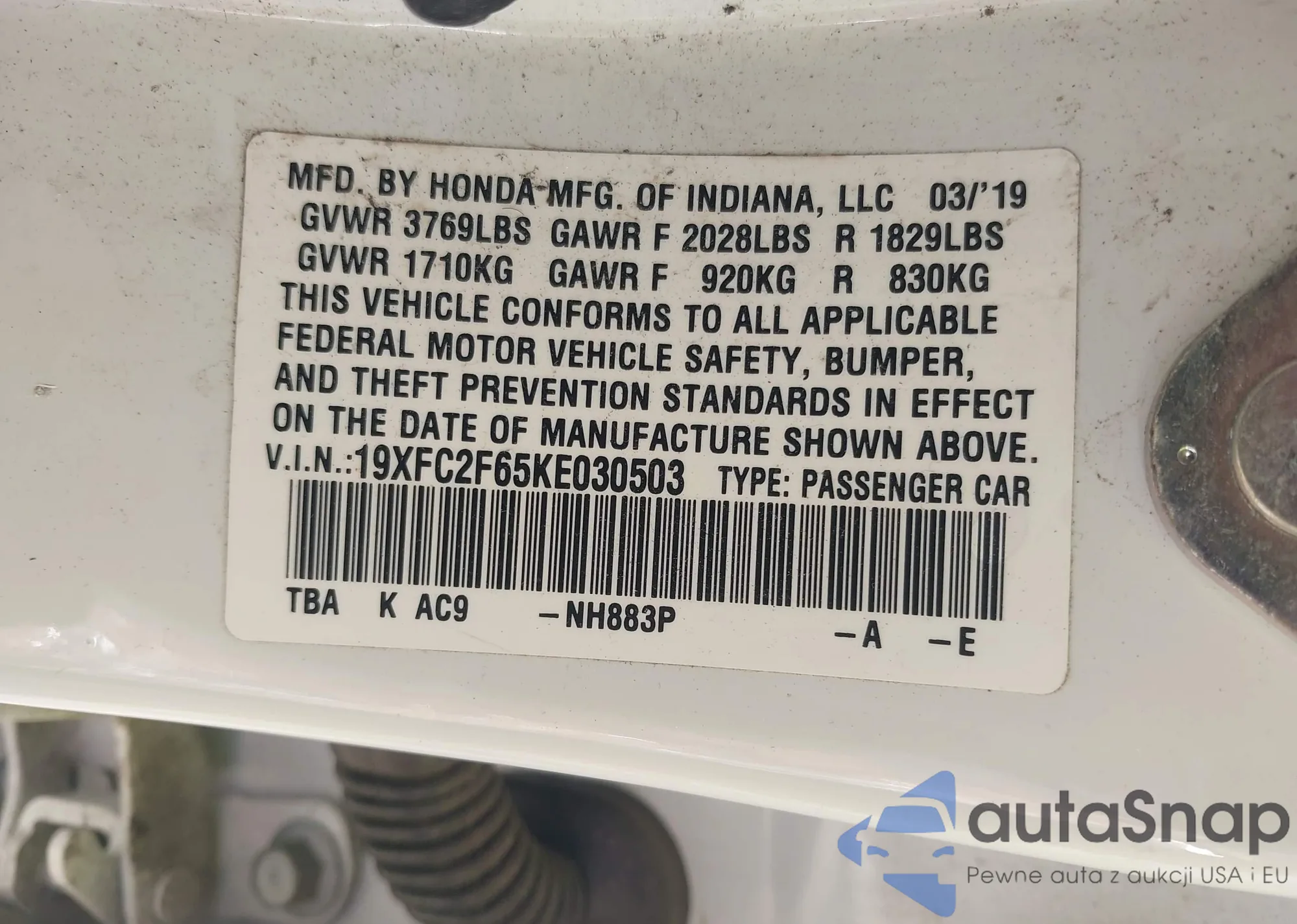 • VIN 19XFC2F65KE030503