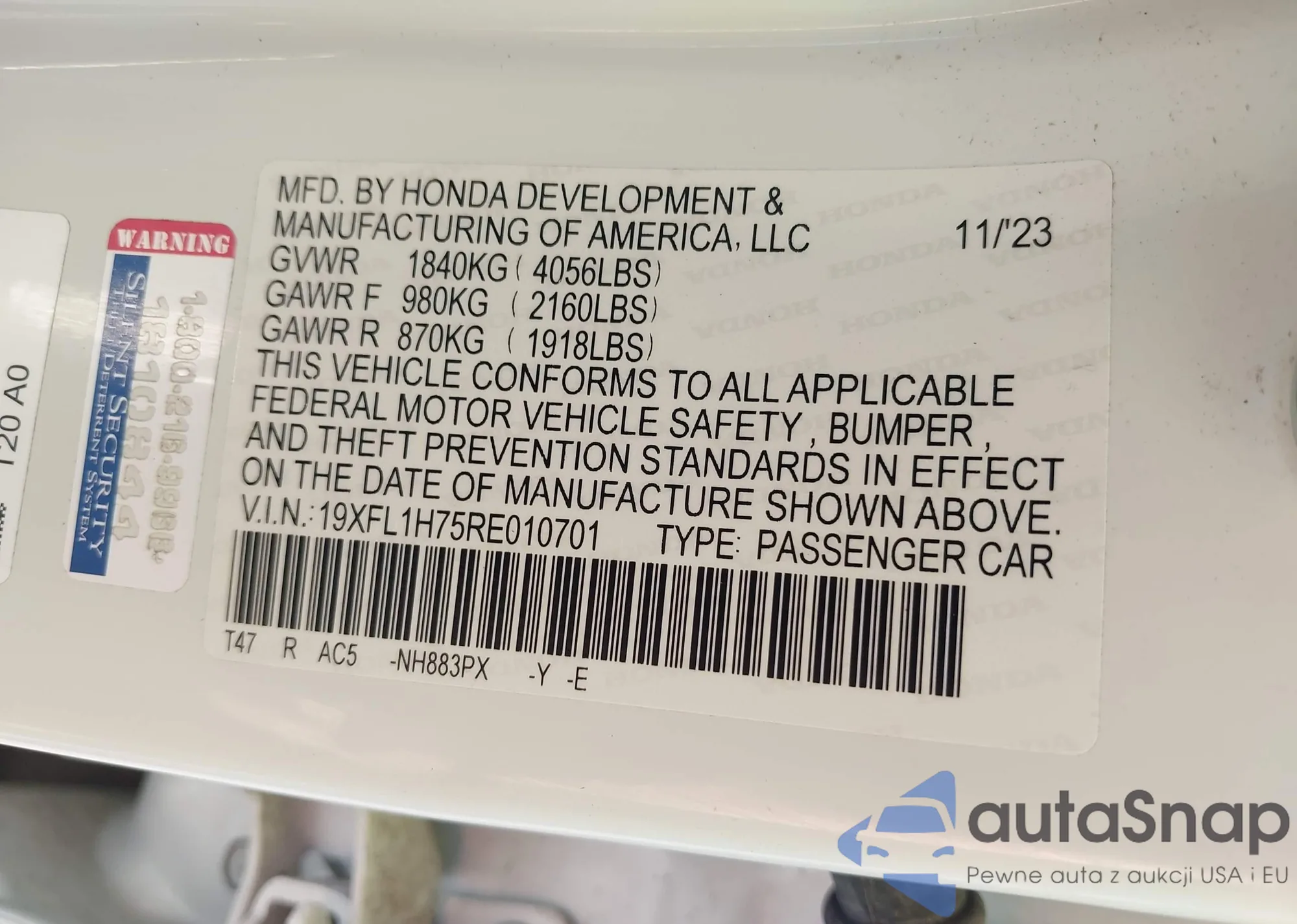 LOT: 43993722 VIN: 2HGFE1F90PH323785