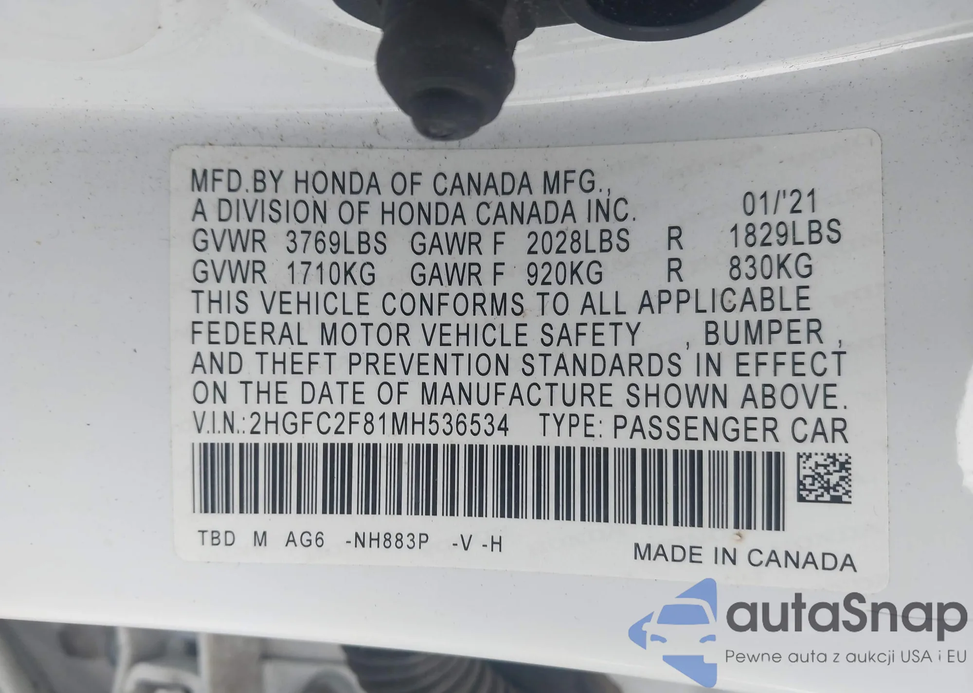 • VIN 2HGFC2F81MH536534
