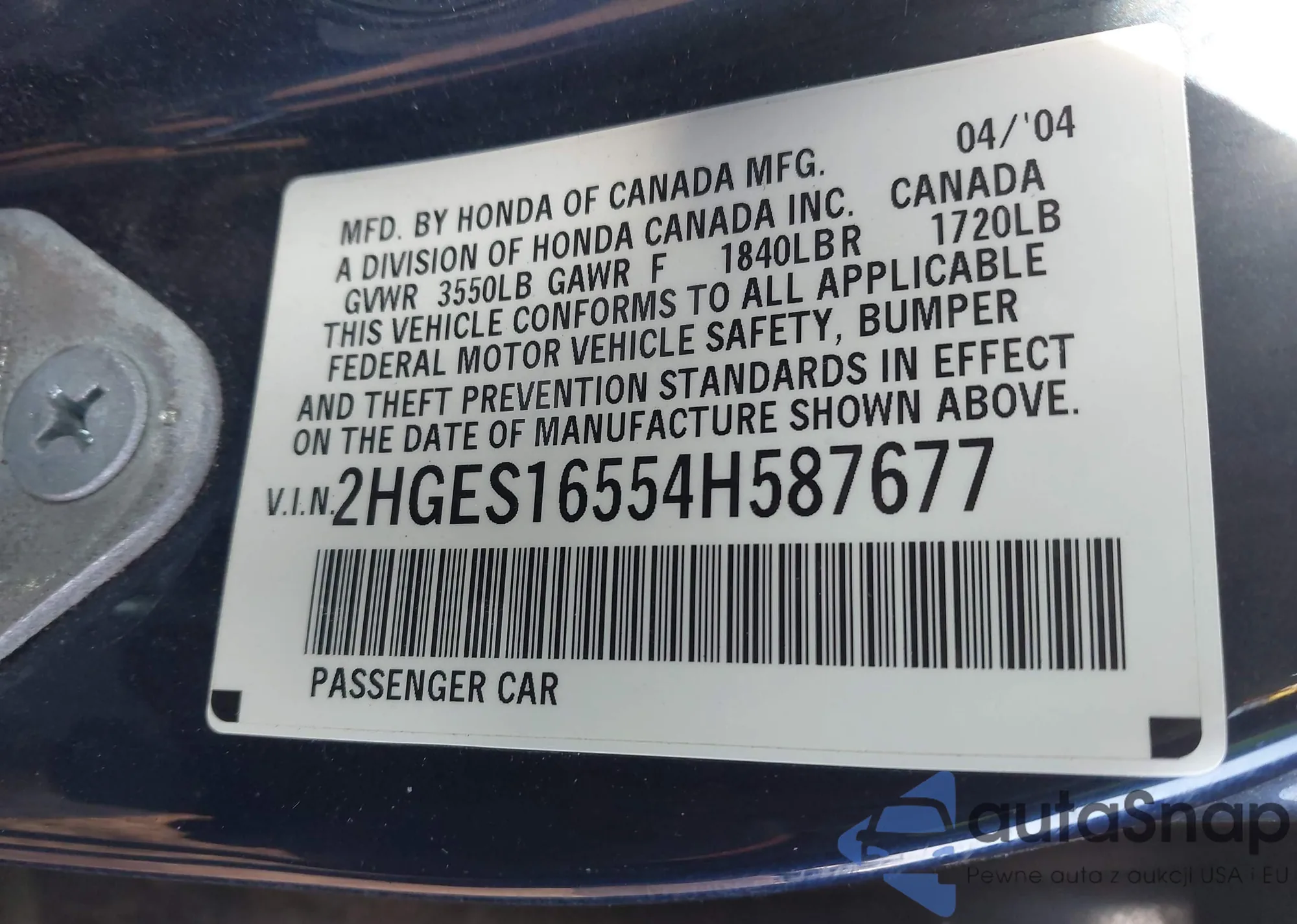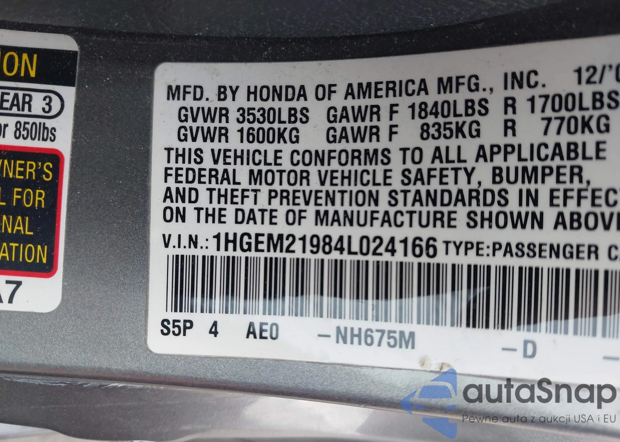 LOT: 44340609 VIN: 1HGEM22534L000479