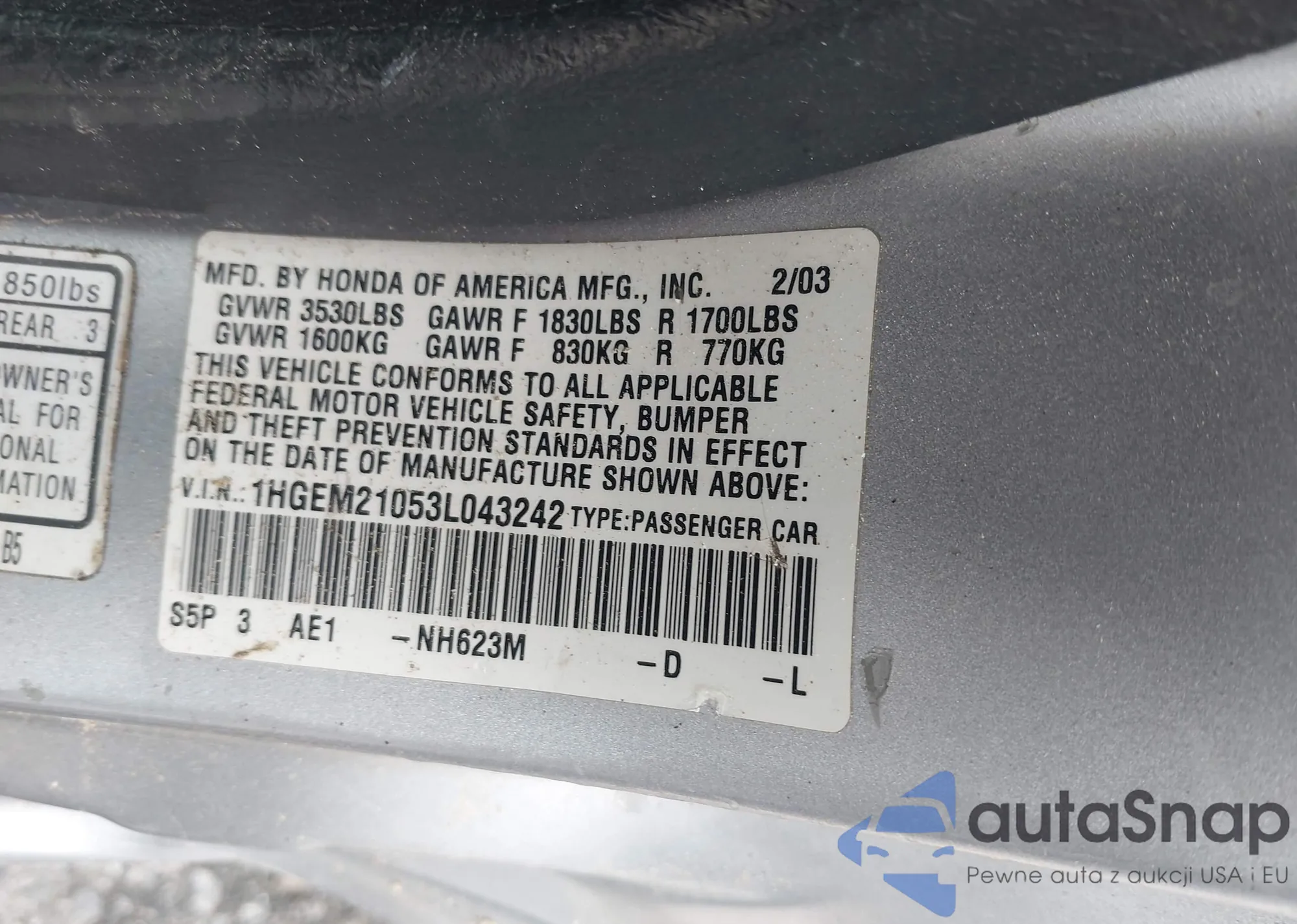 LOT: 44400462 VIN: 1HGEM21053L043242
