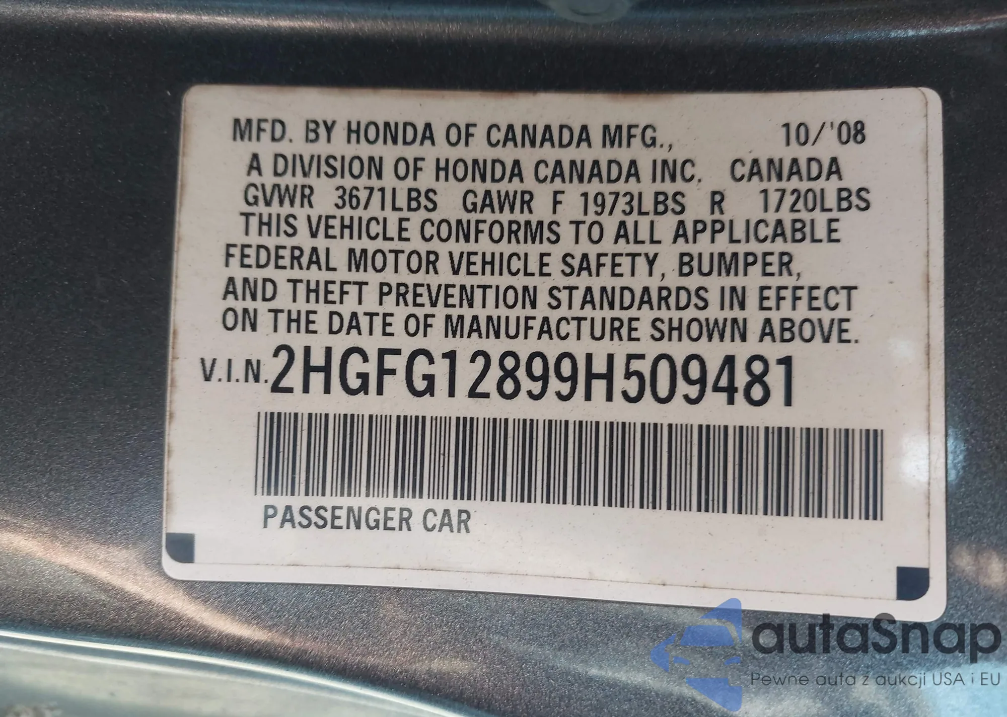 LOT: 44188346 VIN: 2HGFG12899H509481