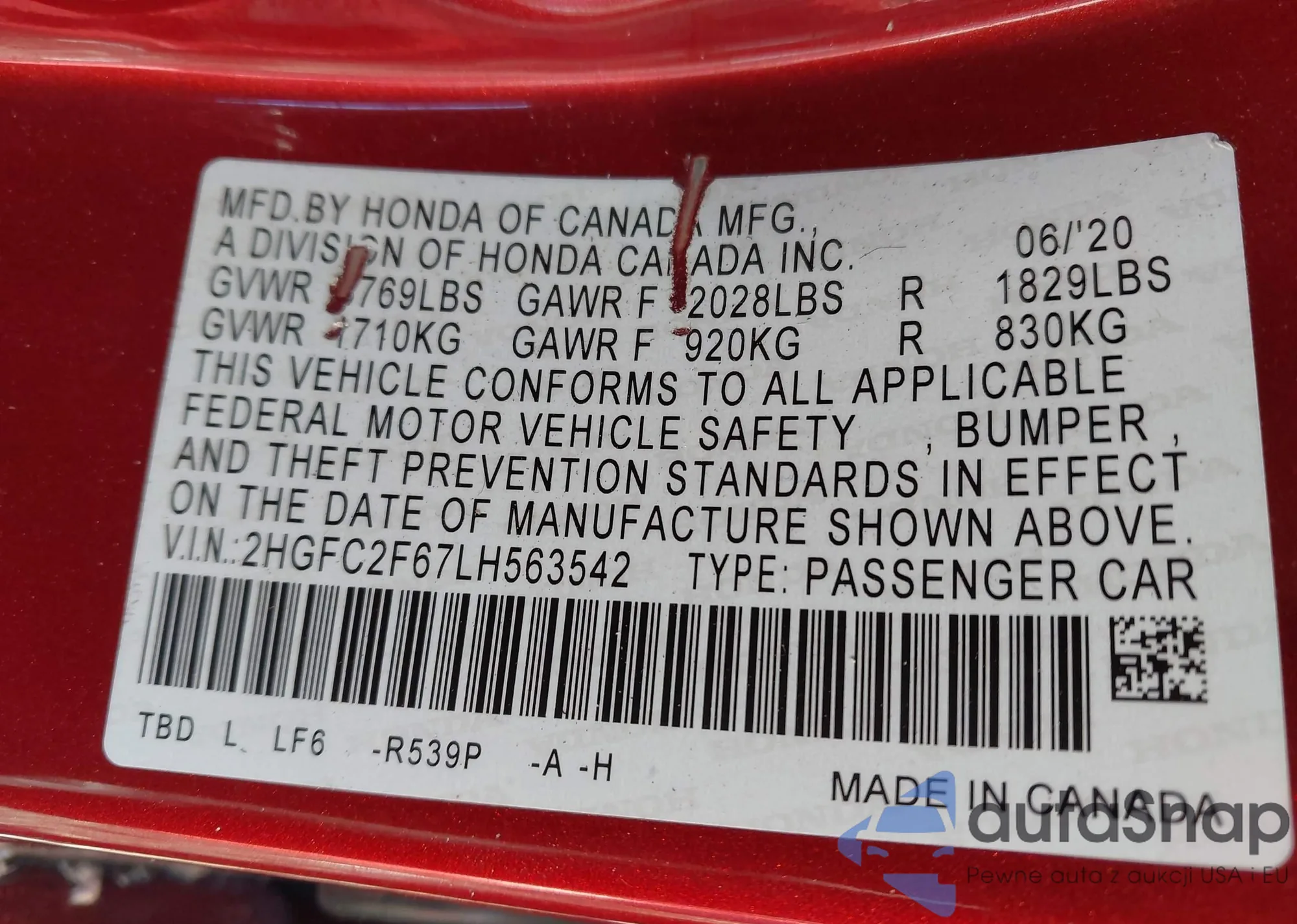 • VIN 2HGFC2F67LH563542