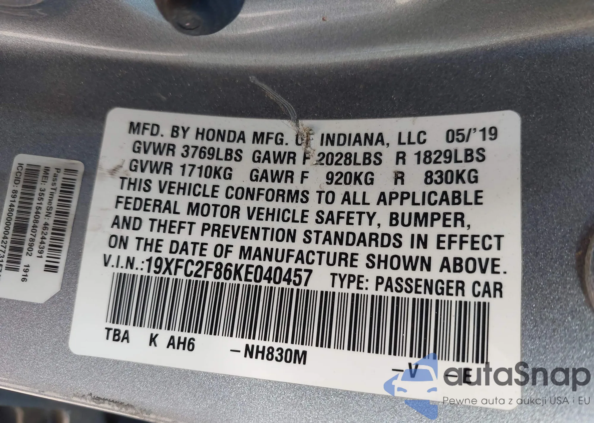 LOT: 44330653 VIN: 2HGFC2F83KH550593