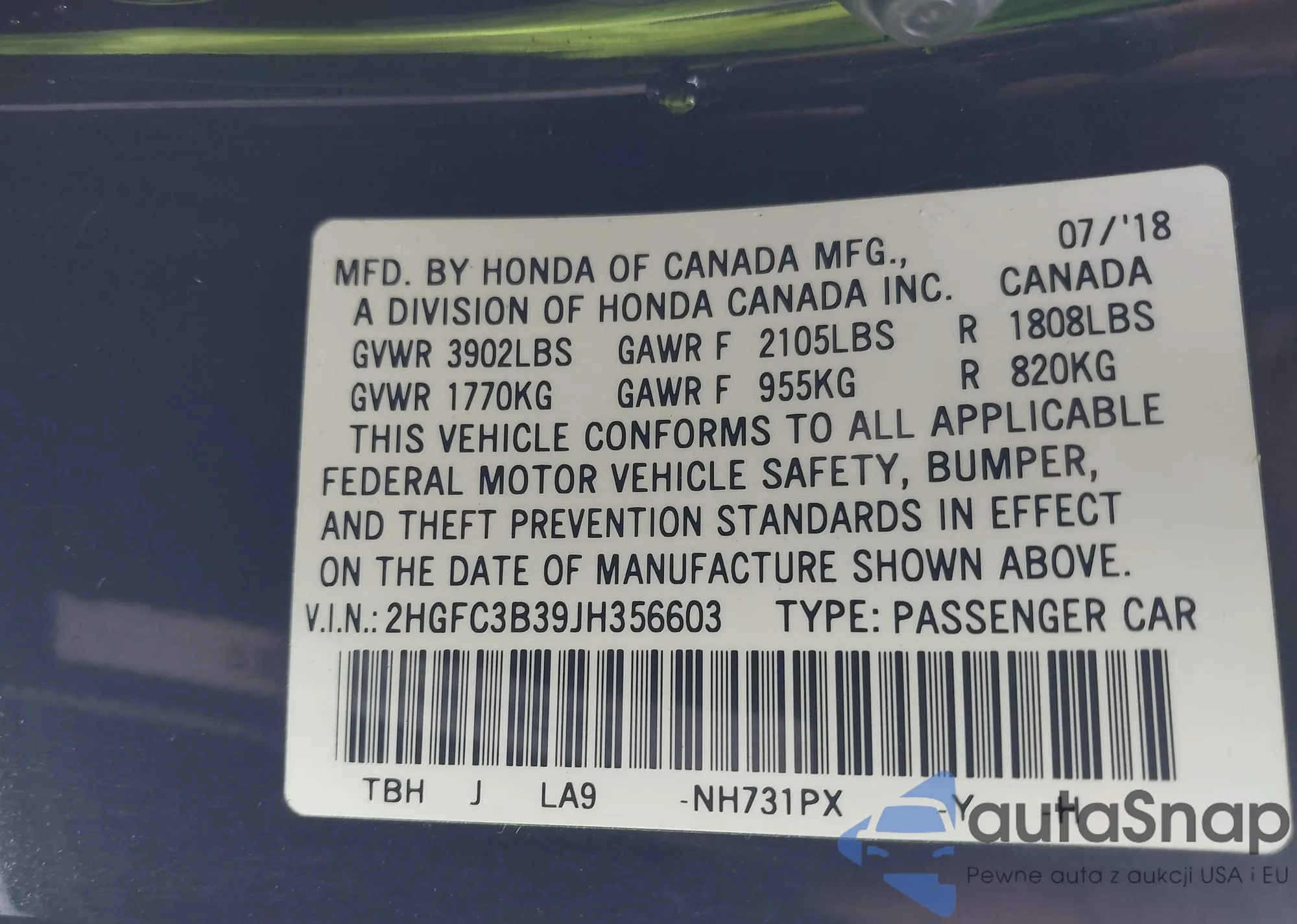 • VIN 2HGFC3B39JH356603