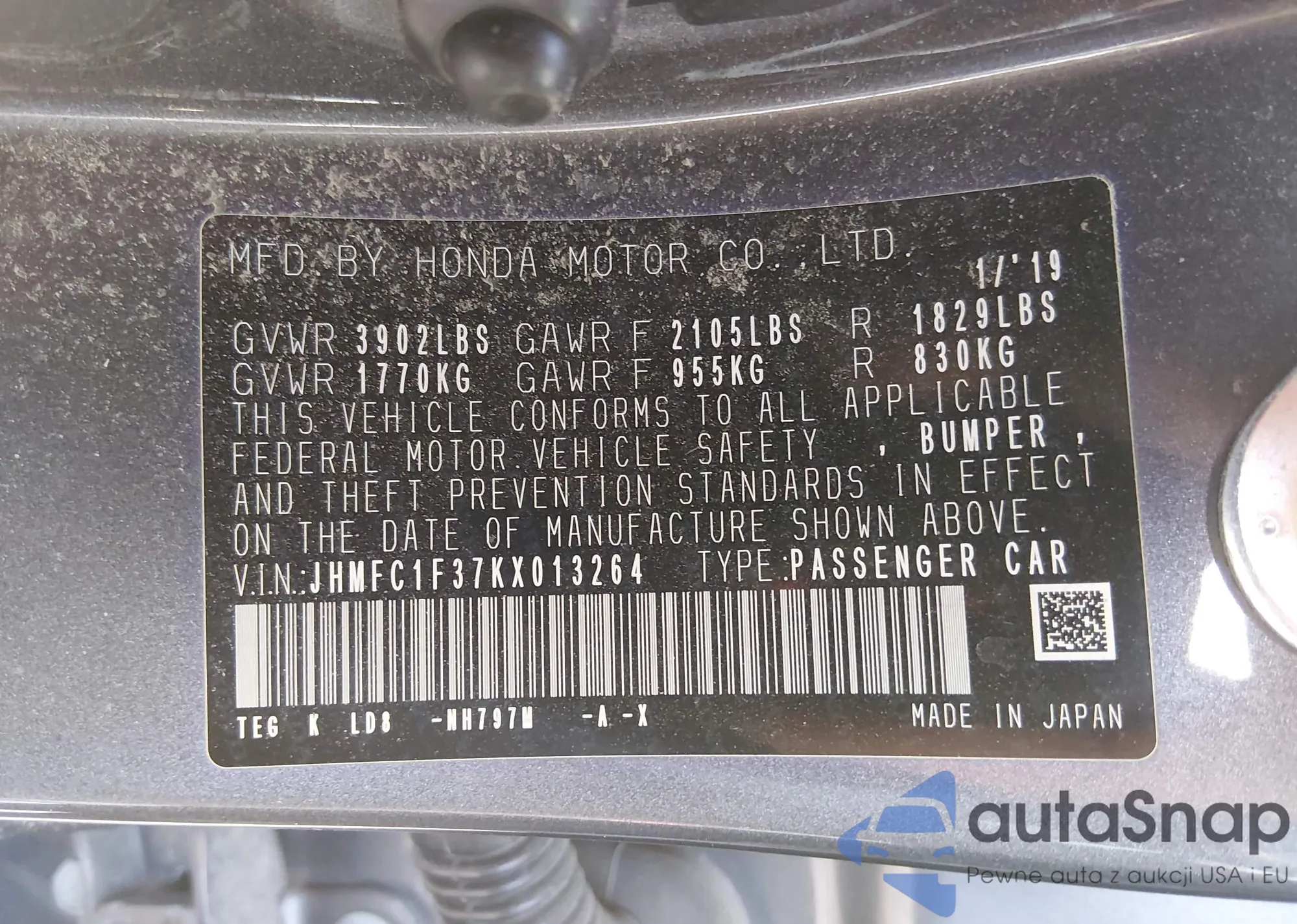 LOT: 44216171 VIN: JHMFC1F37KX013264