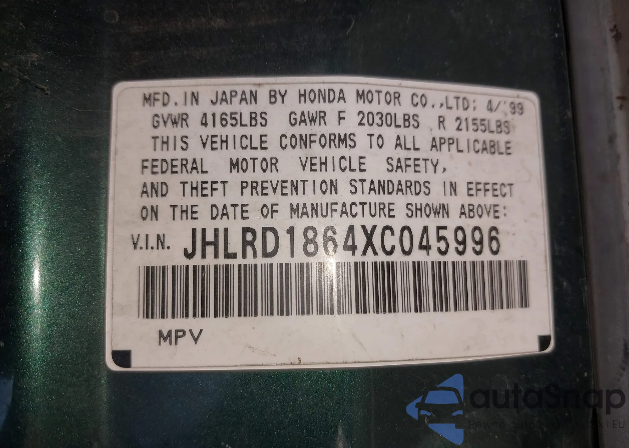 • VIN JHLRD2846XC015872