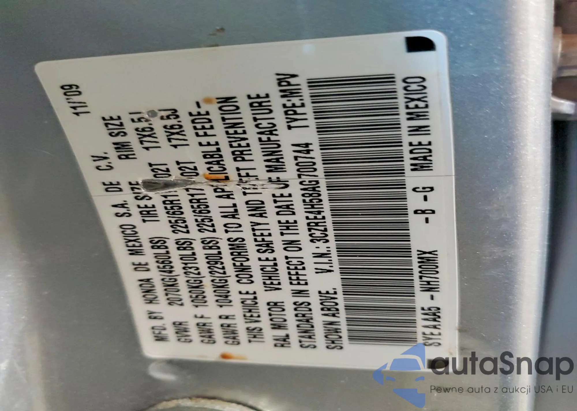 • VIN 3CZRE4H58AG700744