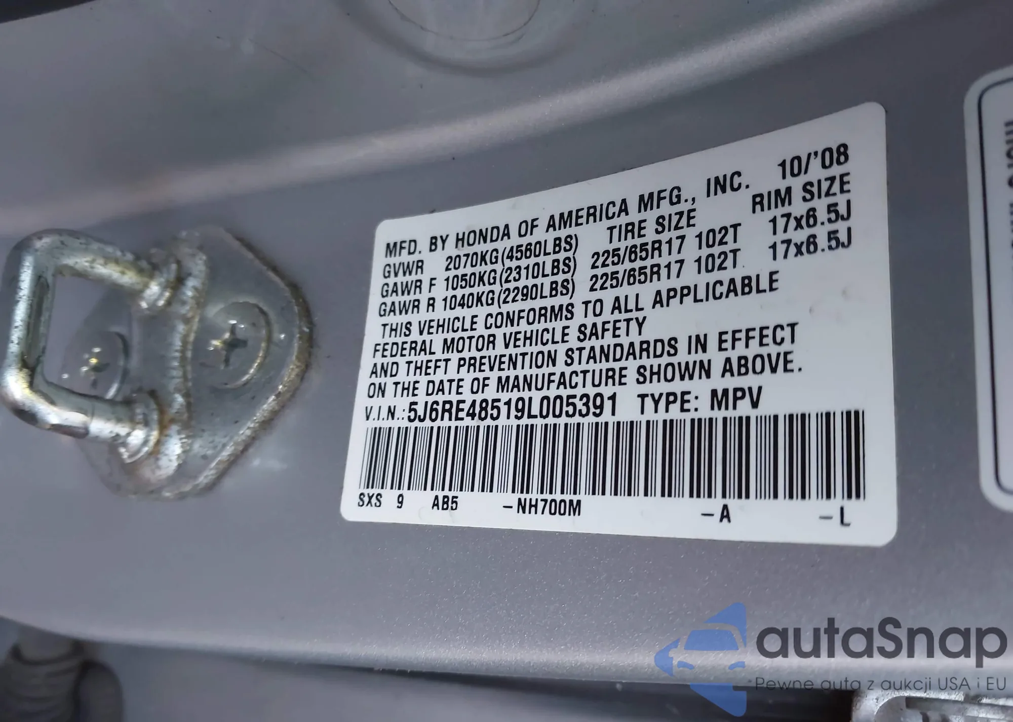 • VIN 5J6RE48519L005391