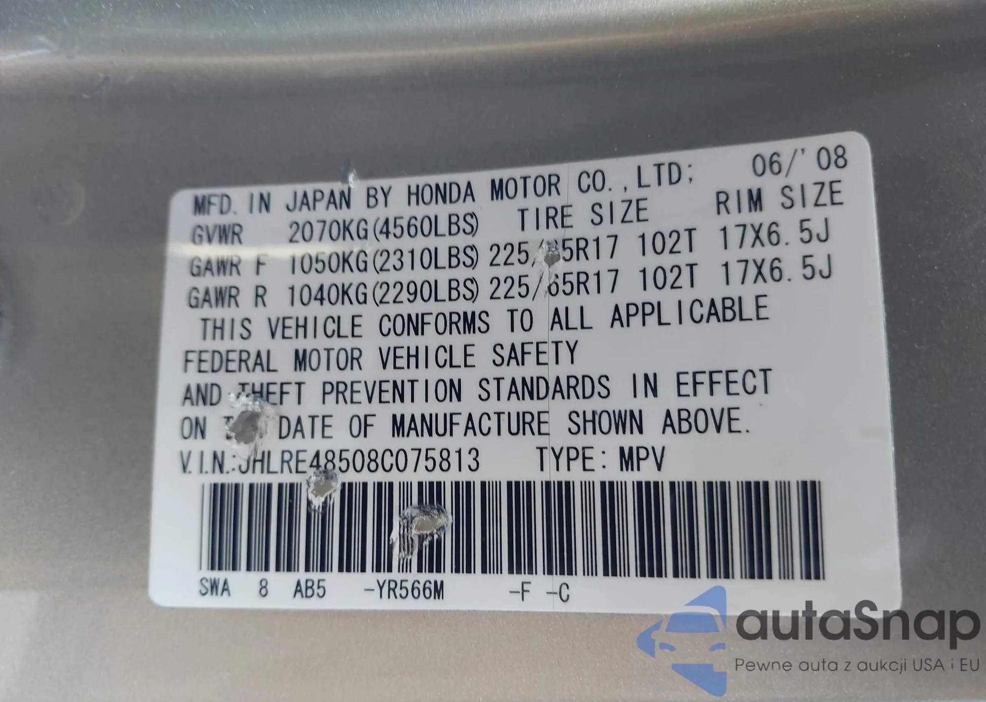 LOT: 44366429 VIN: JHLRE48508C075813