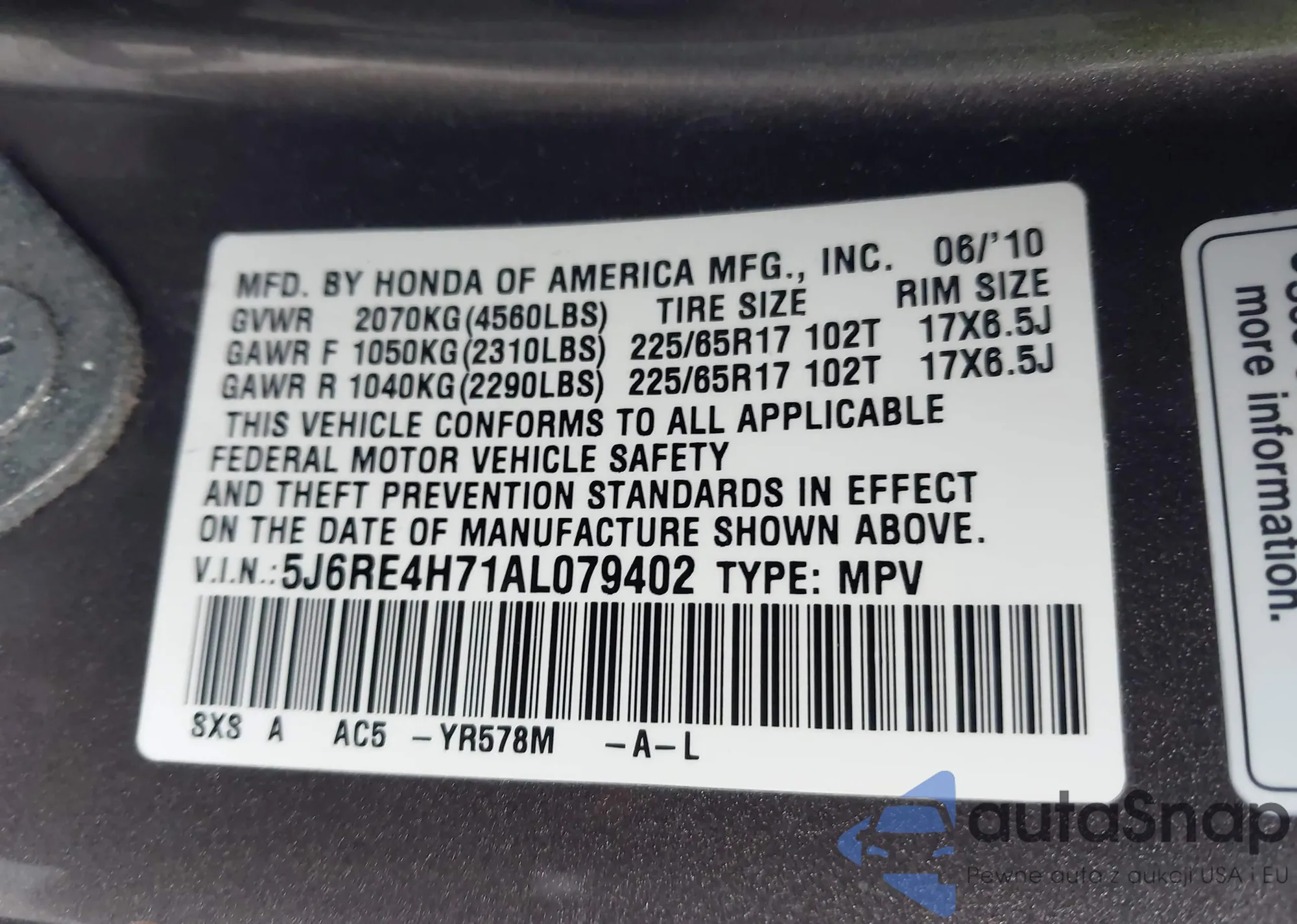 • VIN 5J6RE4H37AL057711