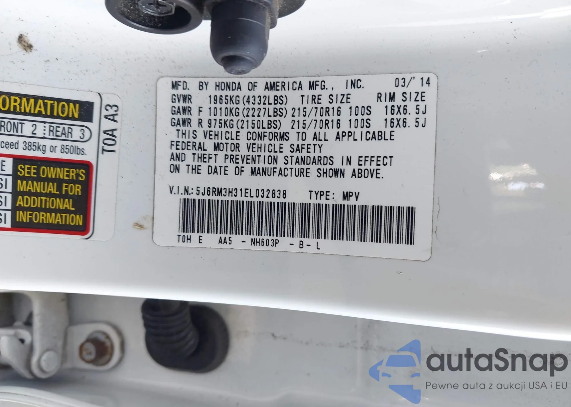 • VIN 5J6RM3H31EL032838