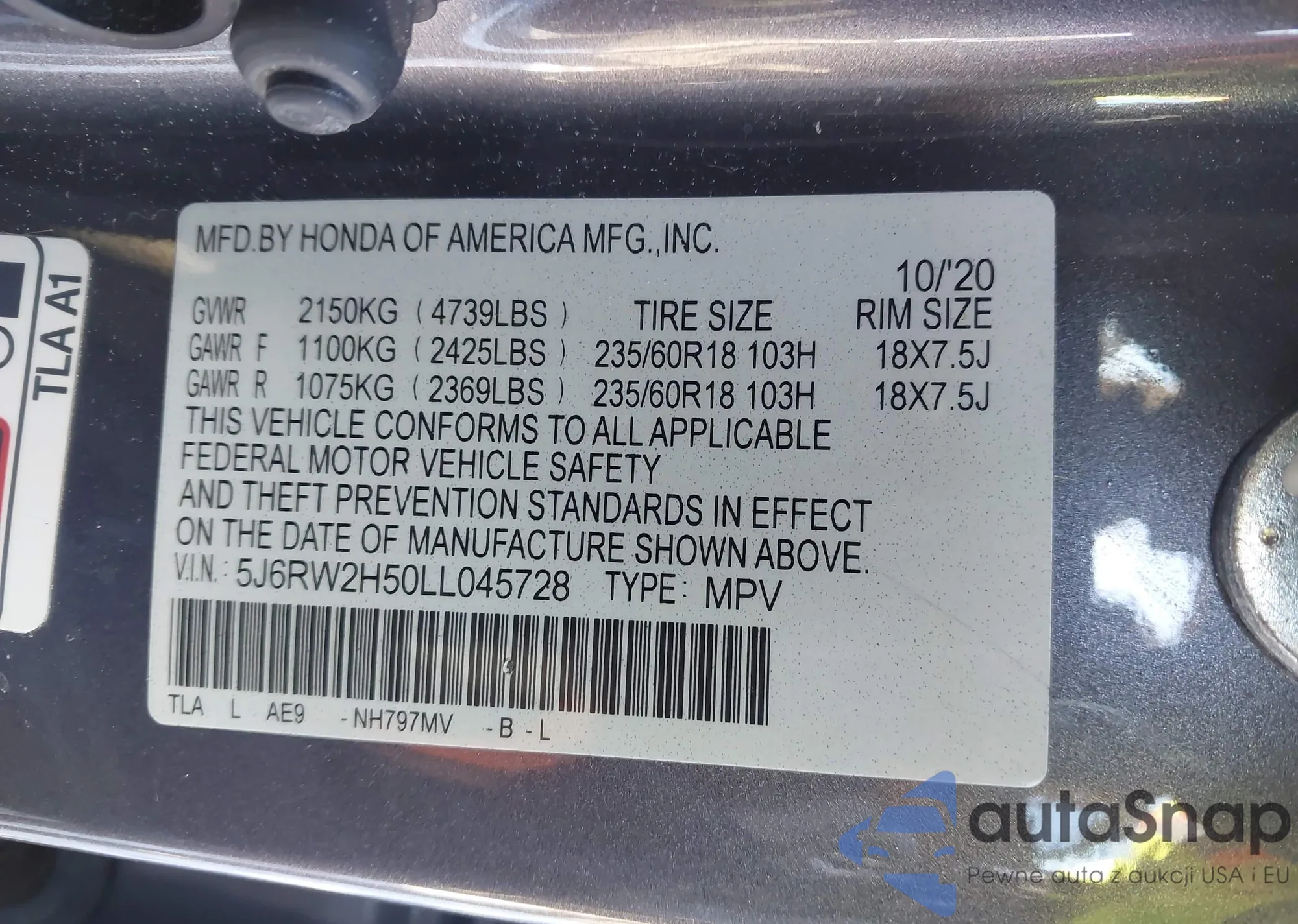 • VIN 5J6RW2H50LL045728