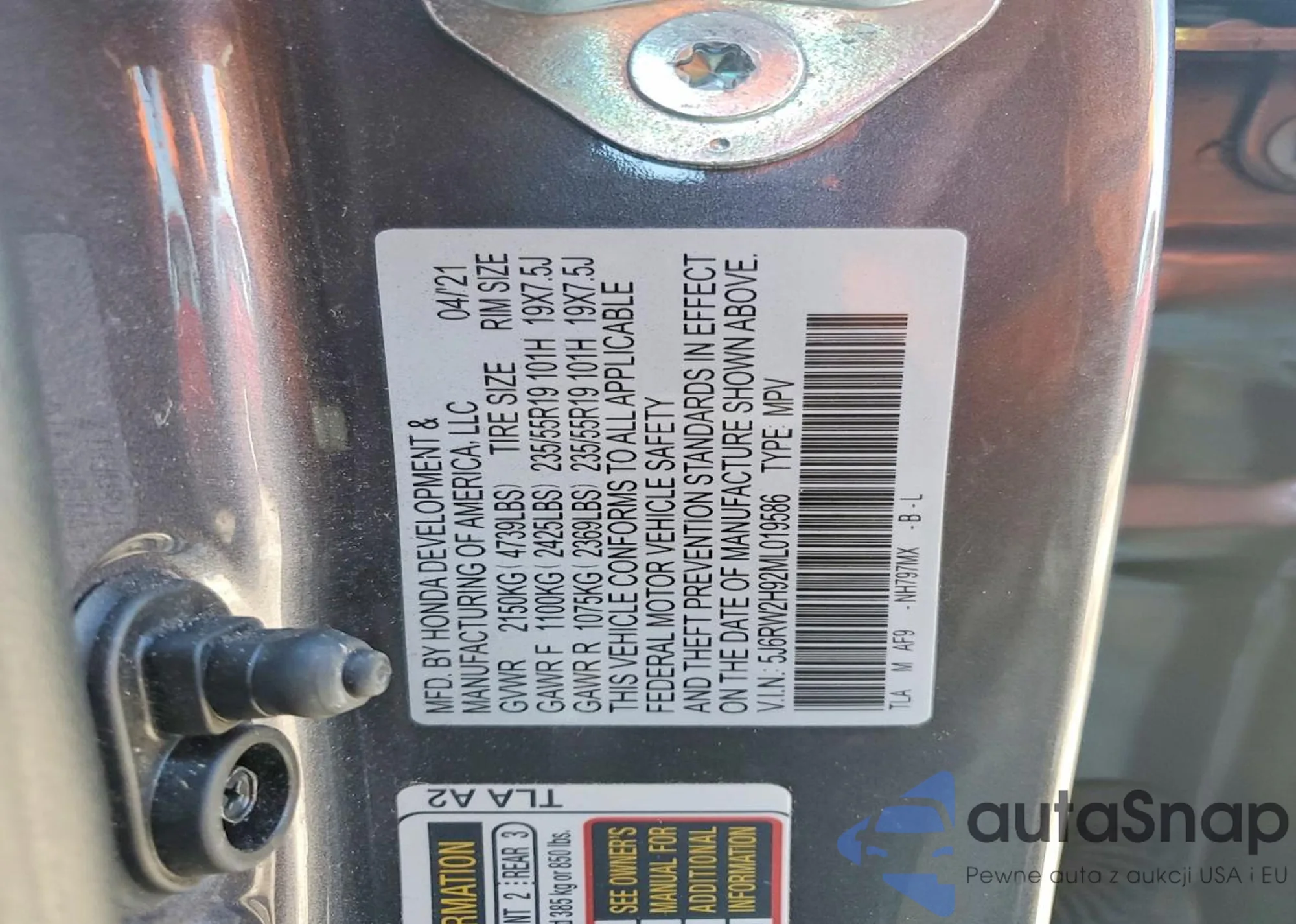 • VIN 5J6RW2H92ML019586