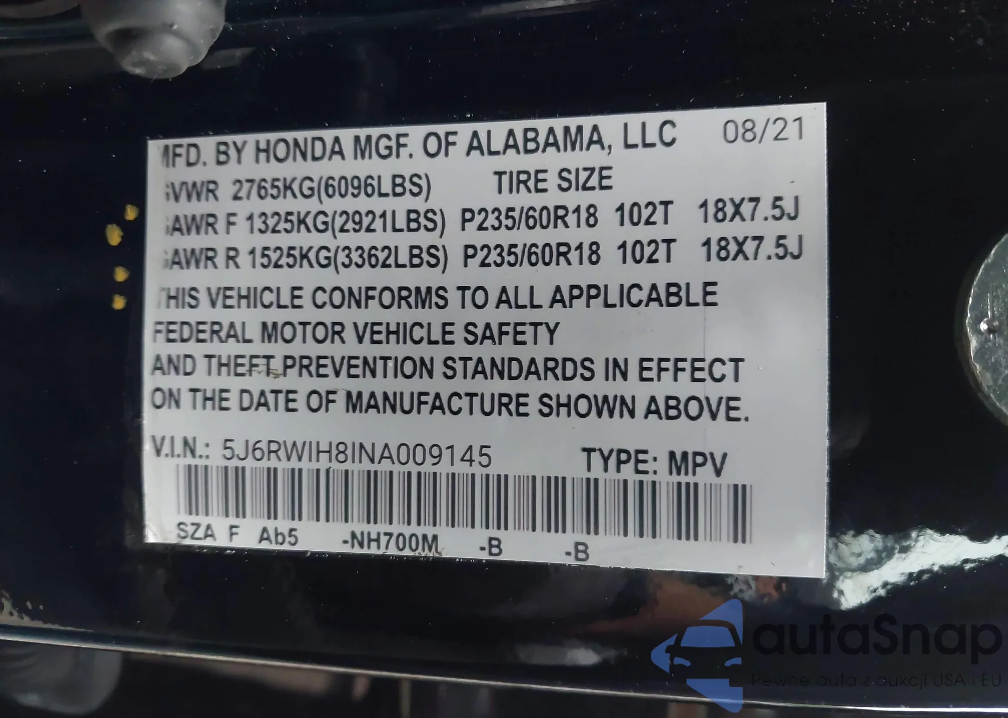 • VIN 5J6RW2H59MA005449