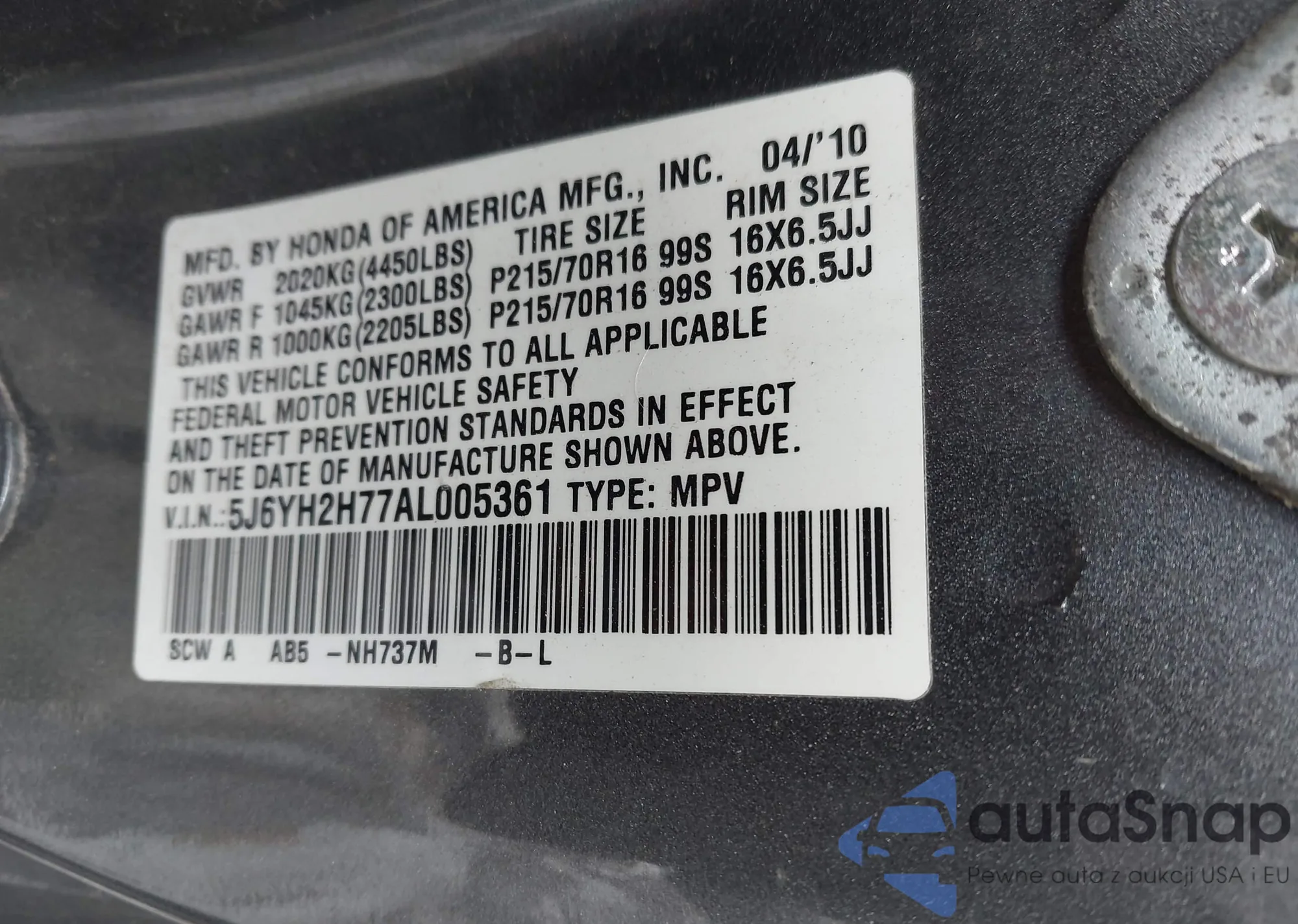 • VIN 5J6YH2H77AL005361