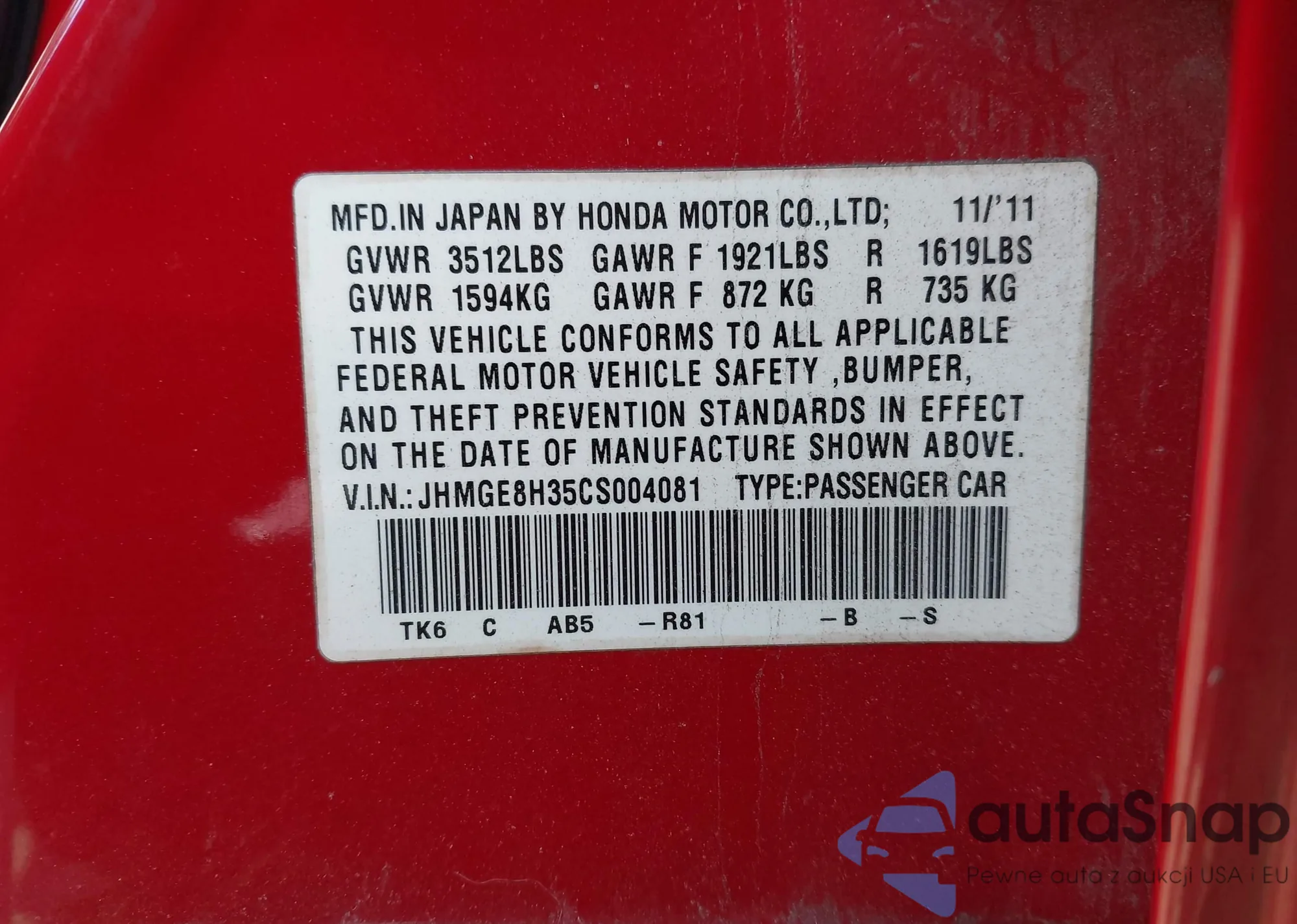 • VIN JHMGE8H35CS004081