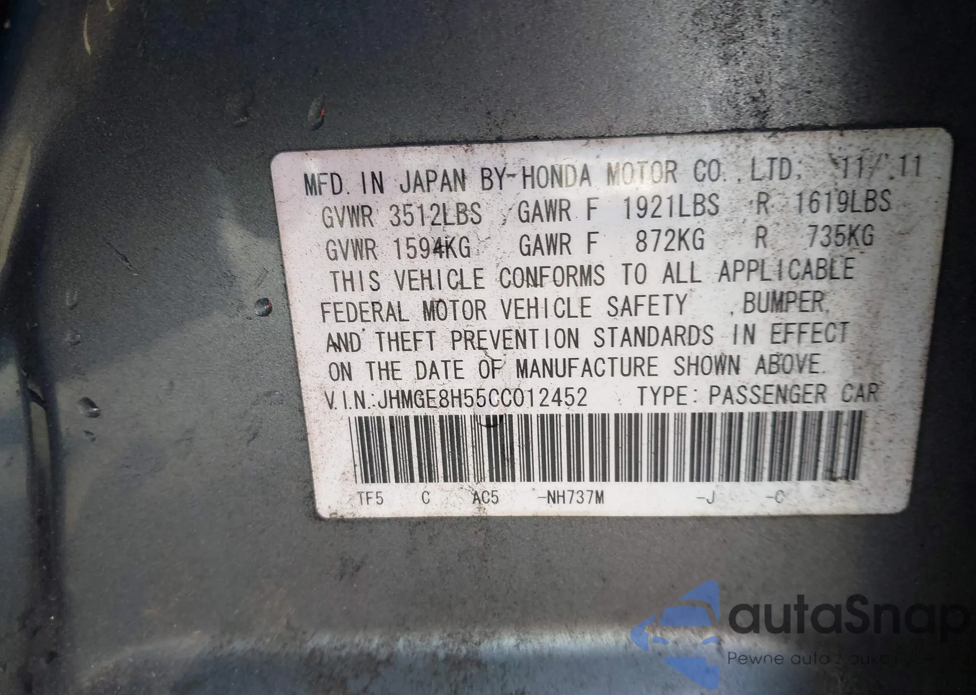 • VIN JHMGE8H55CC012452