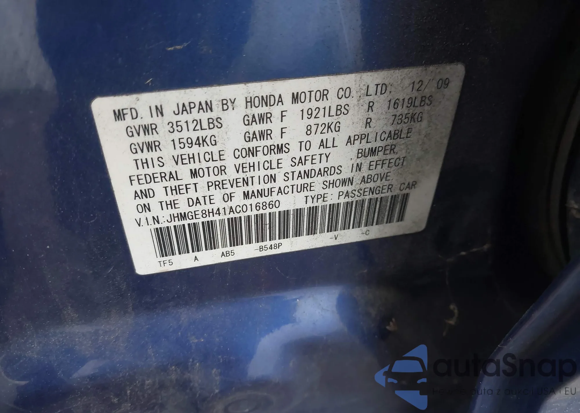 LOT: 44433991 VIN: JHMGE8H41AC016860