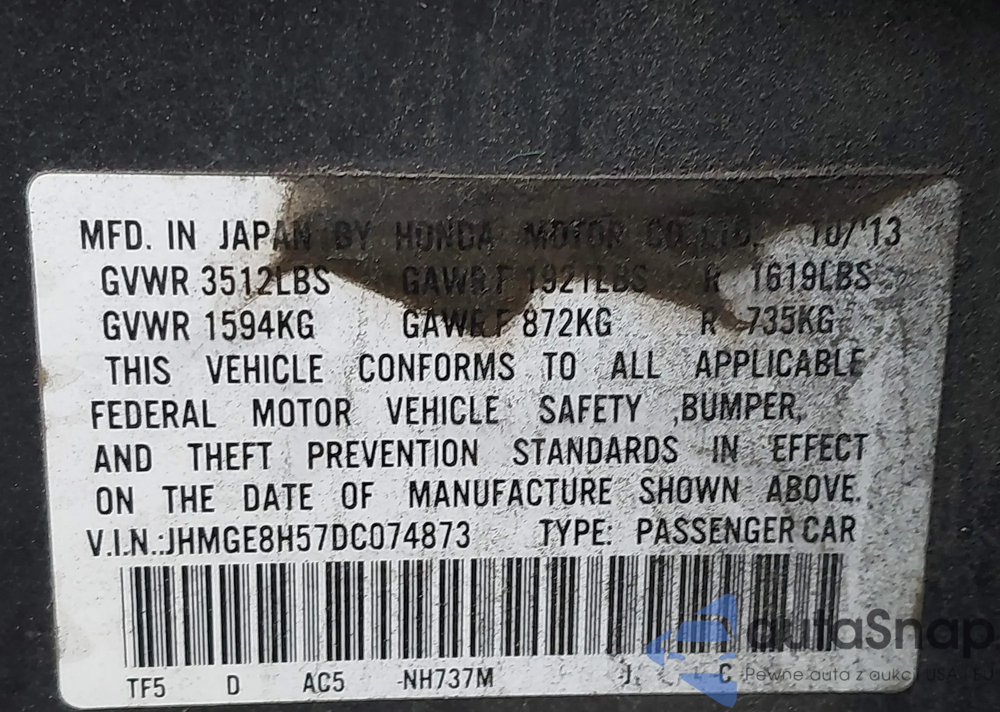 • VIN JHMGE8H57DC074873