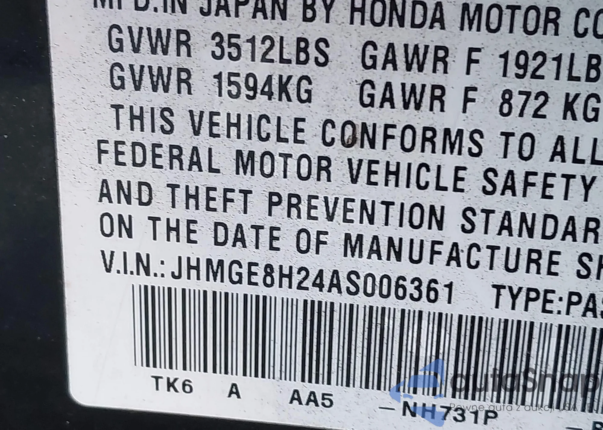 LOT: 44369612 VIN: JHMGE8H24AS006361