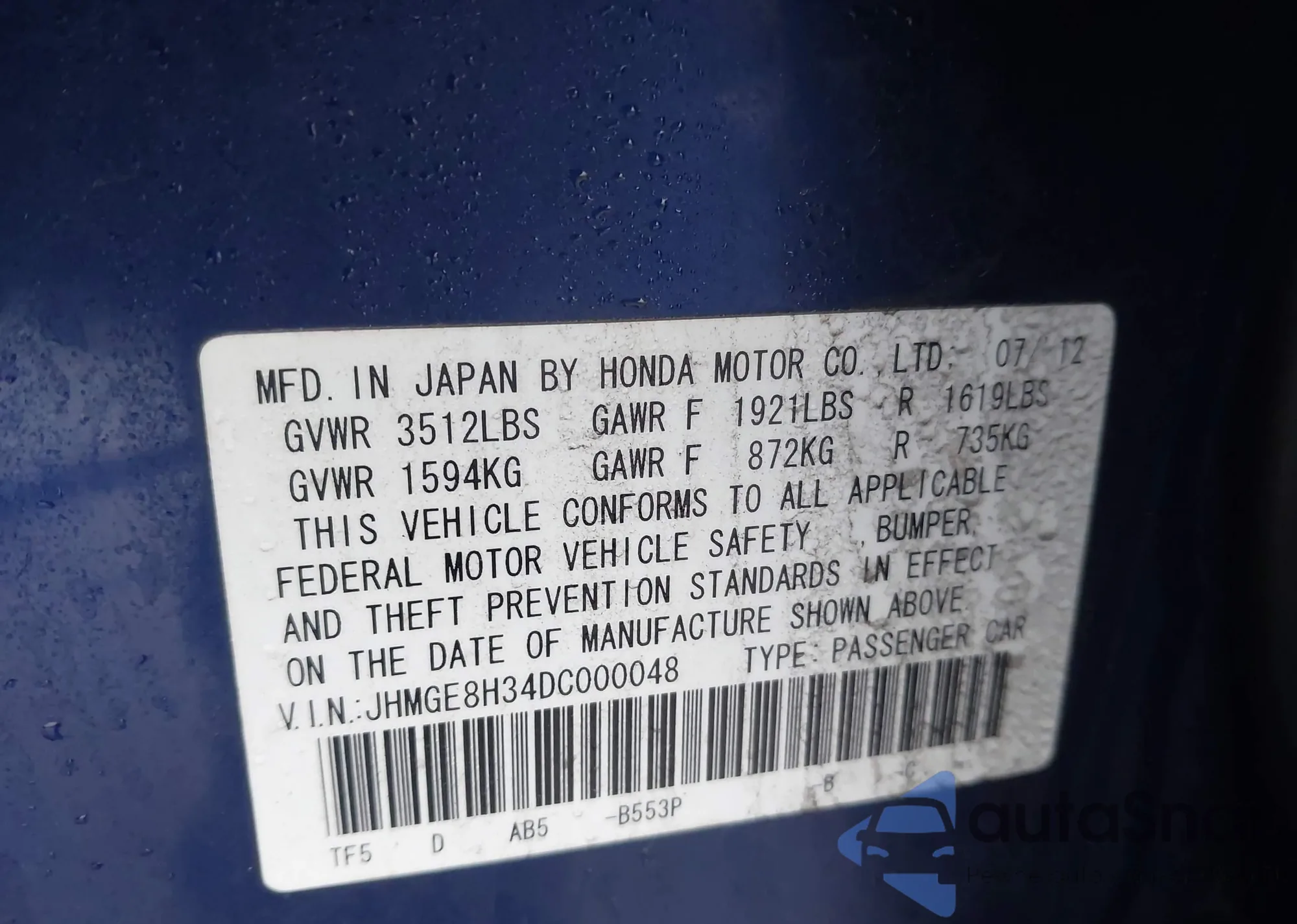 • VIN JHMGE8H34DC000048