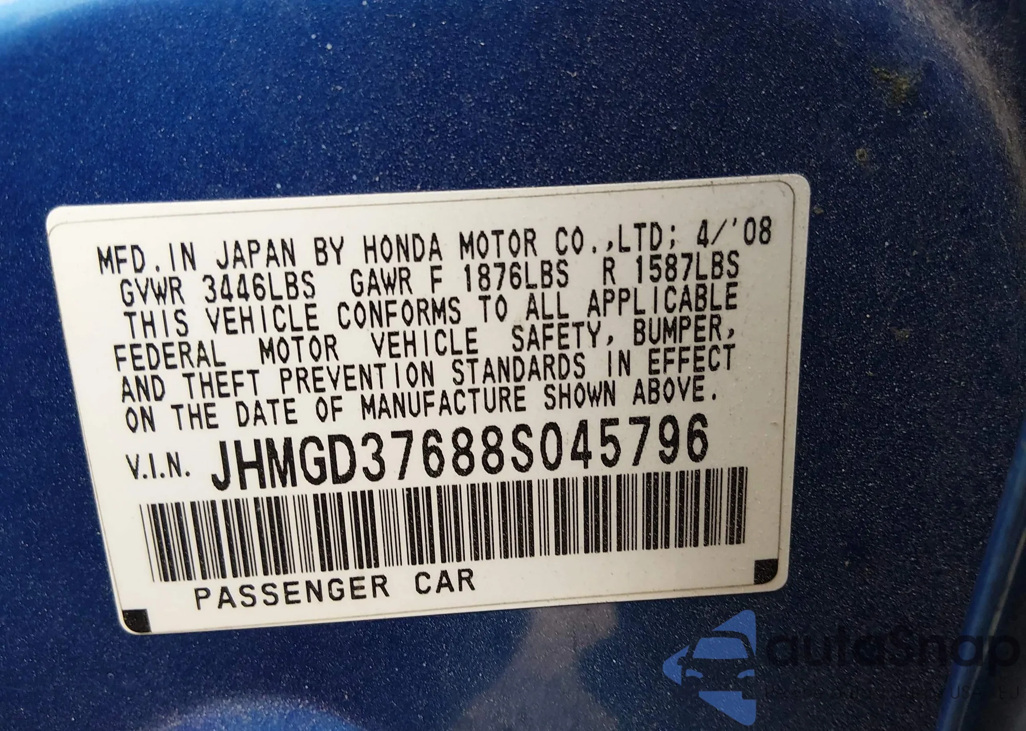 LOT: 44189116 VIN: JHMGD37688S045796