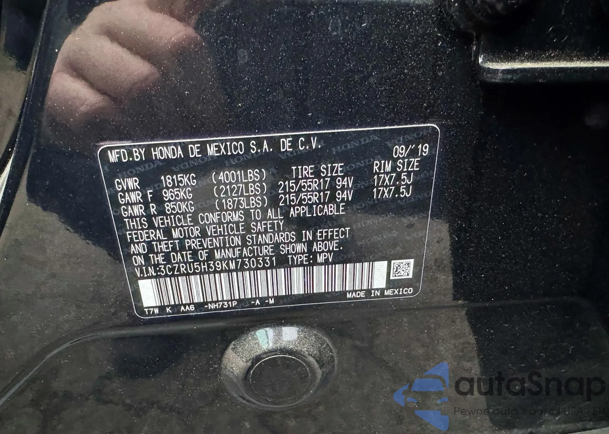 • VIN 3CZRU5H39KM730331