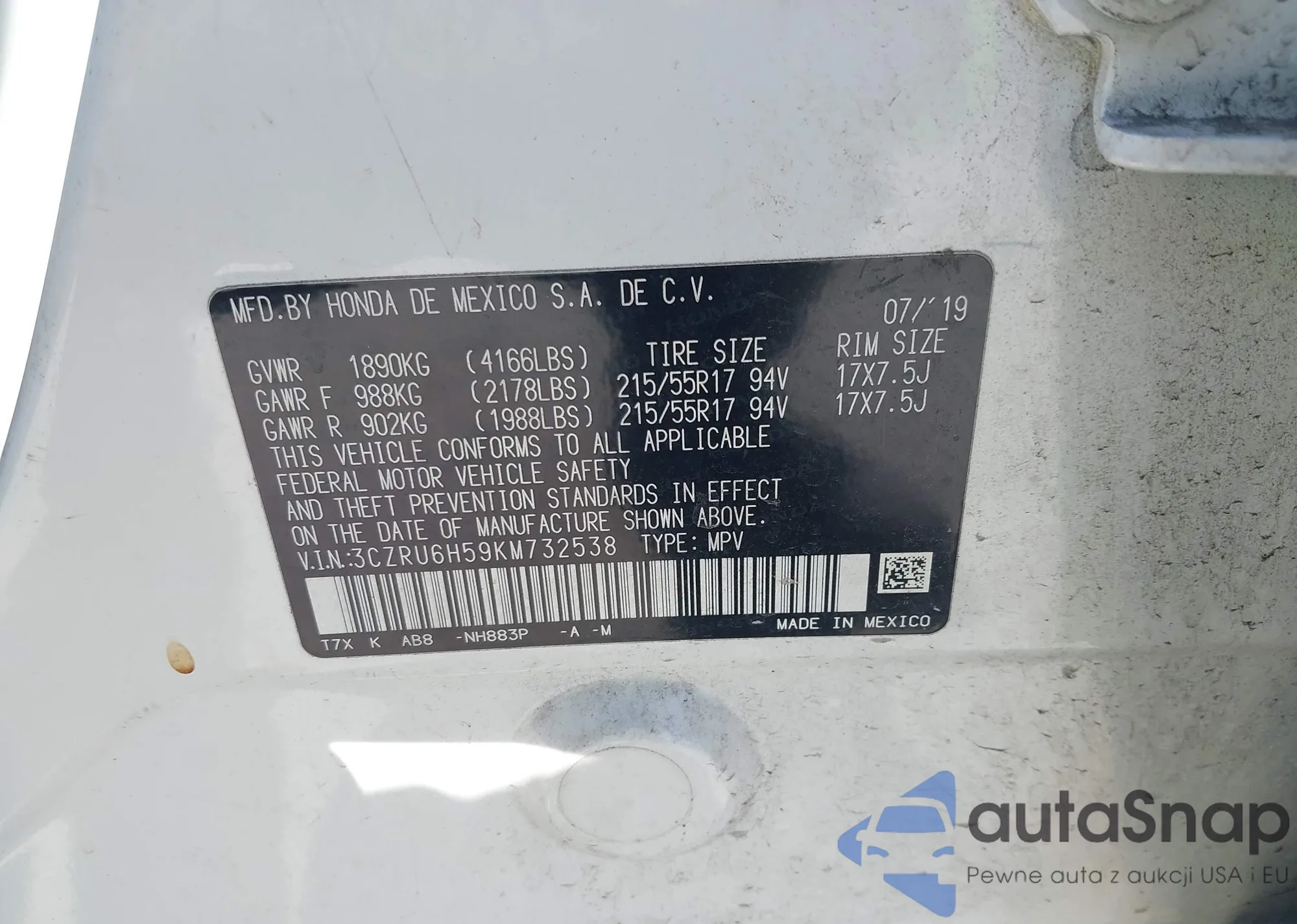 • VIN 3CZRU6H59KM732538