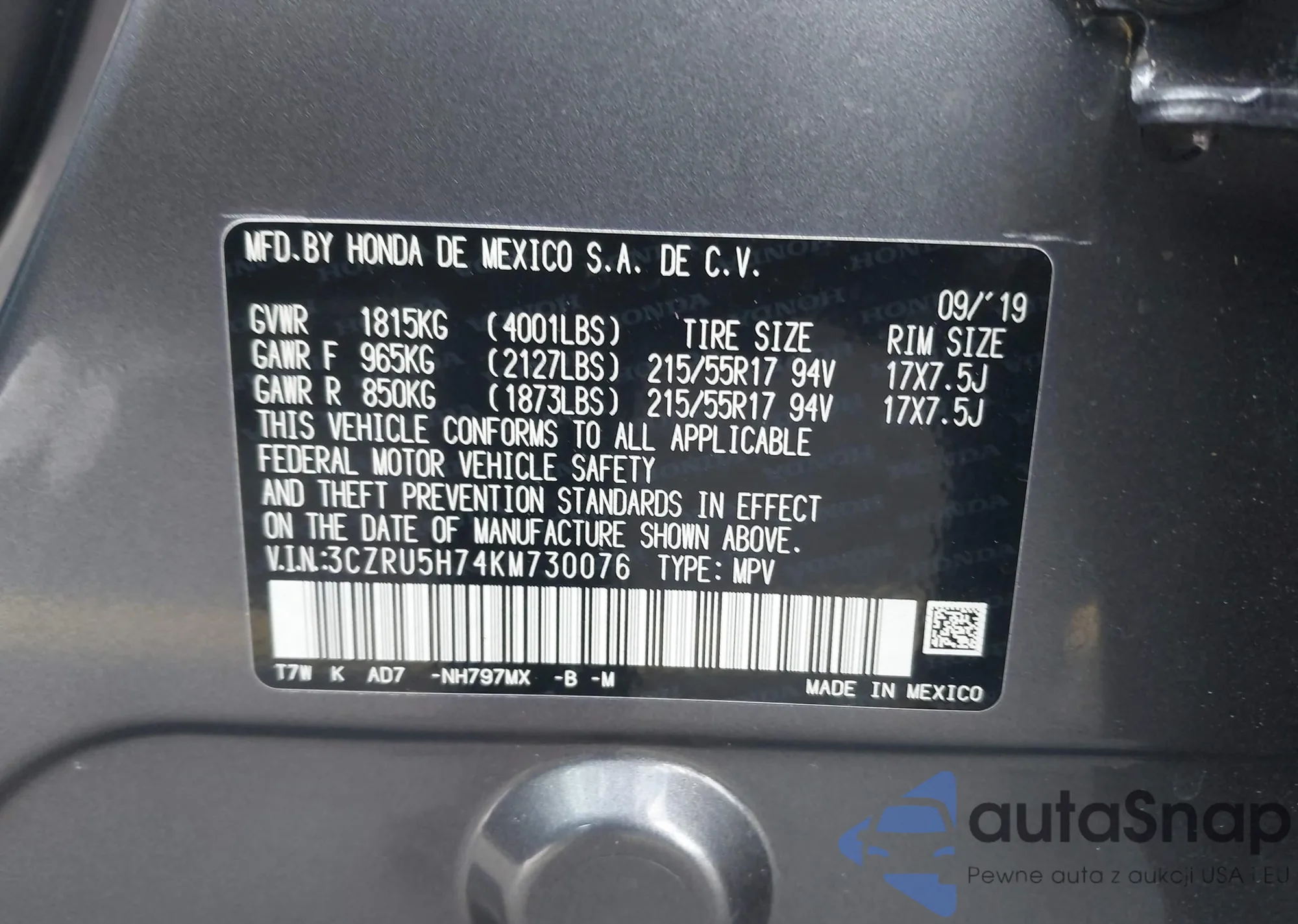 LOT: 44406907 VIN: 3CZRU5H74KM730076