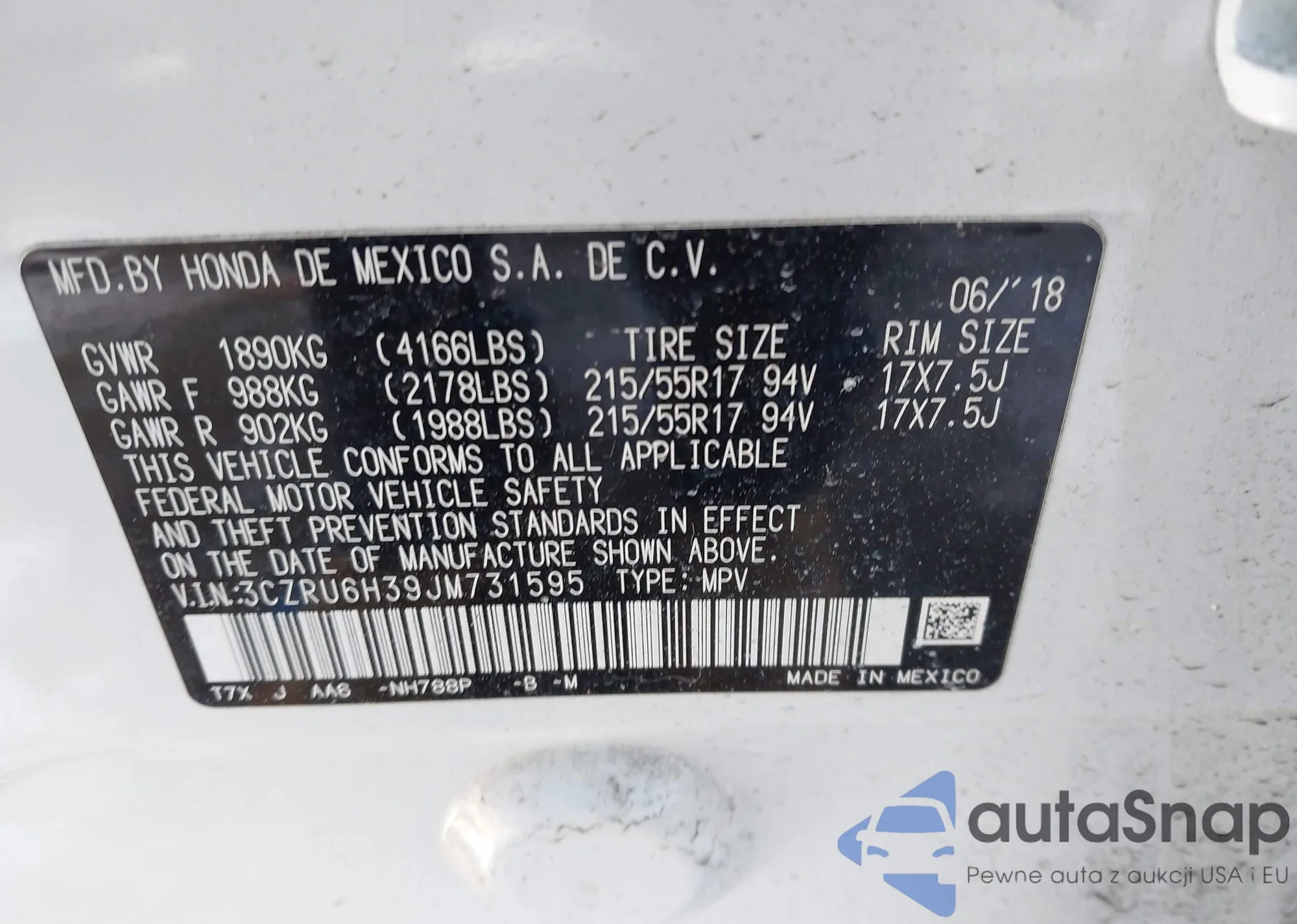 • VIN 3CZRU6H39JM731595
