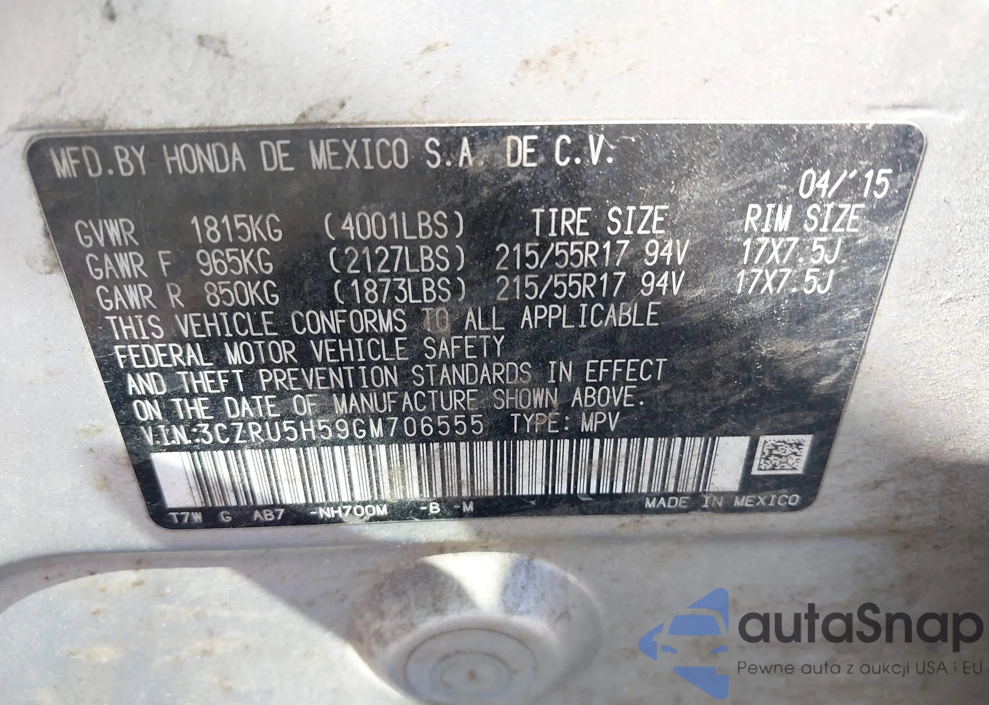 • VIN 3CZRU5H59GM706555
