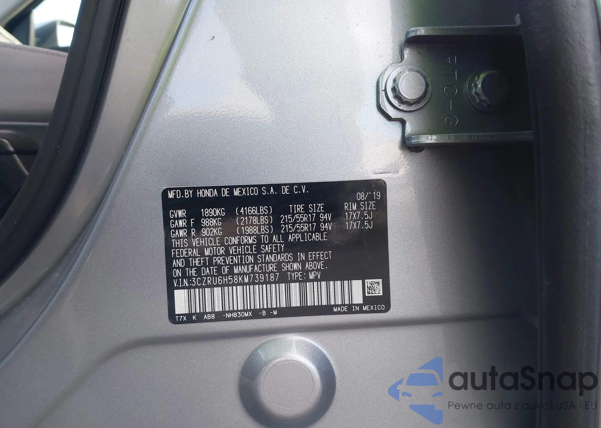 • VIN 3CZRU6H58KM739187
