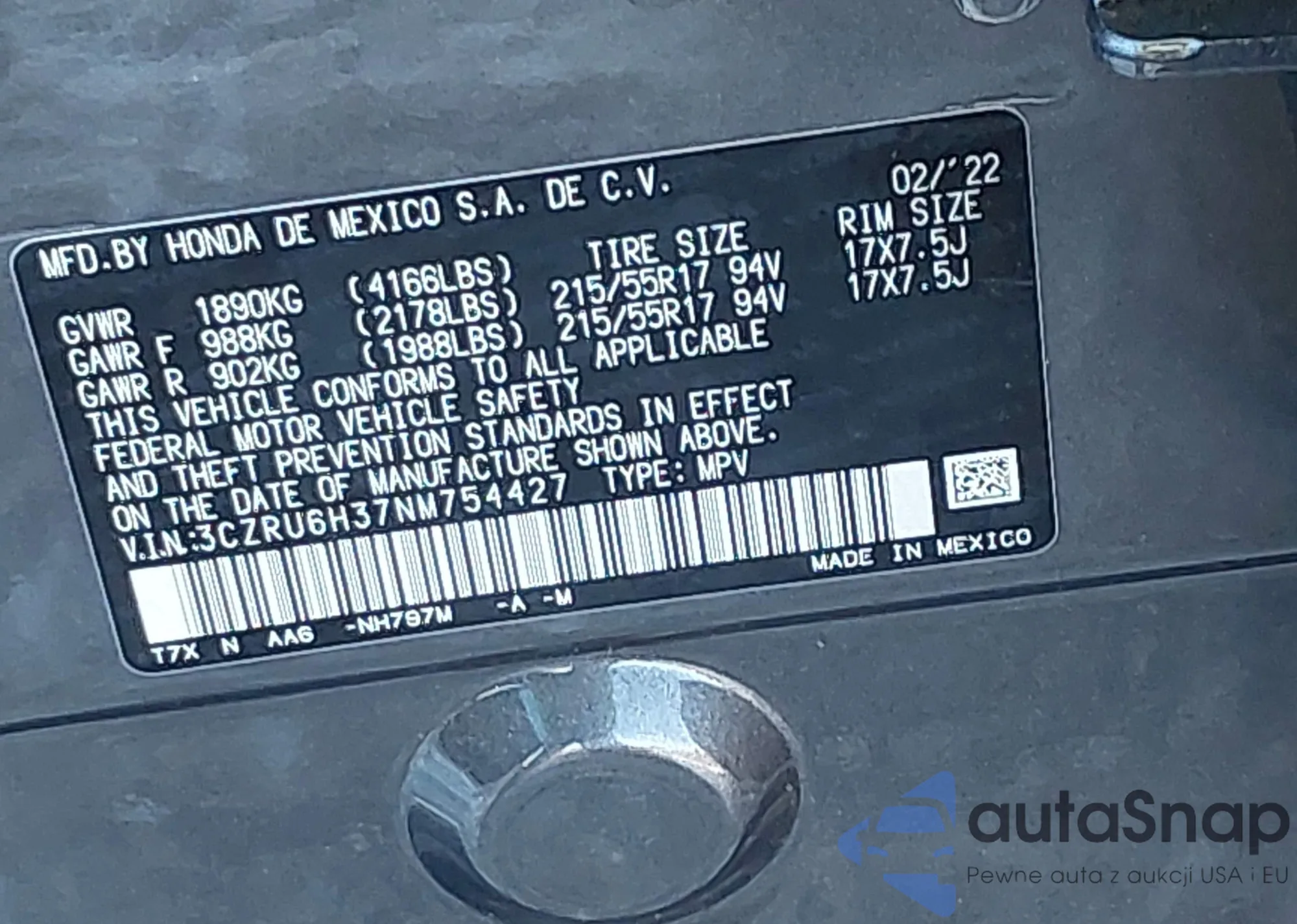 • VIN 3CZRU6H37NM754427