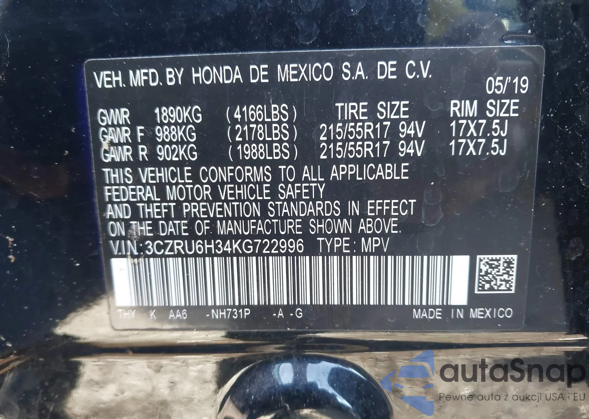 • VIN 3CZRU6H34KG722996
