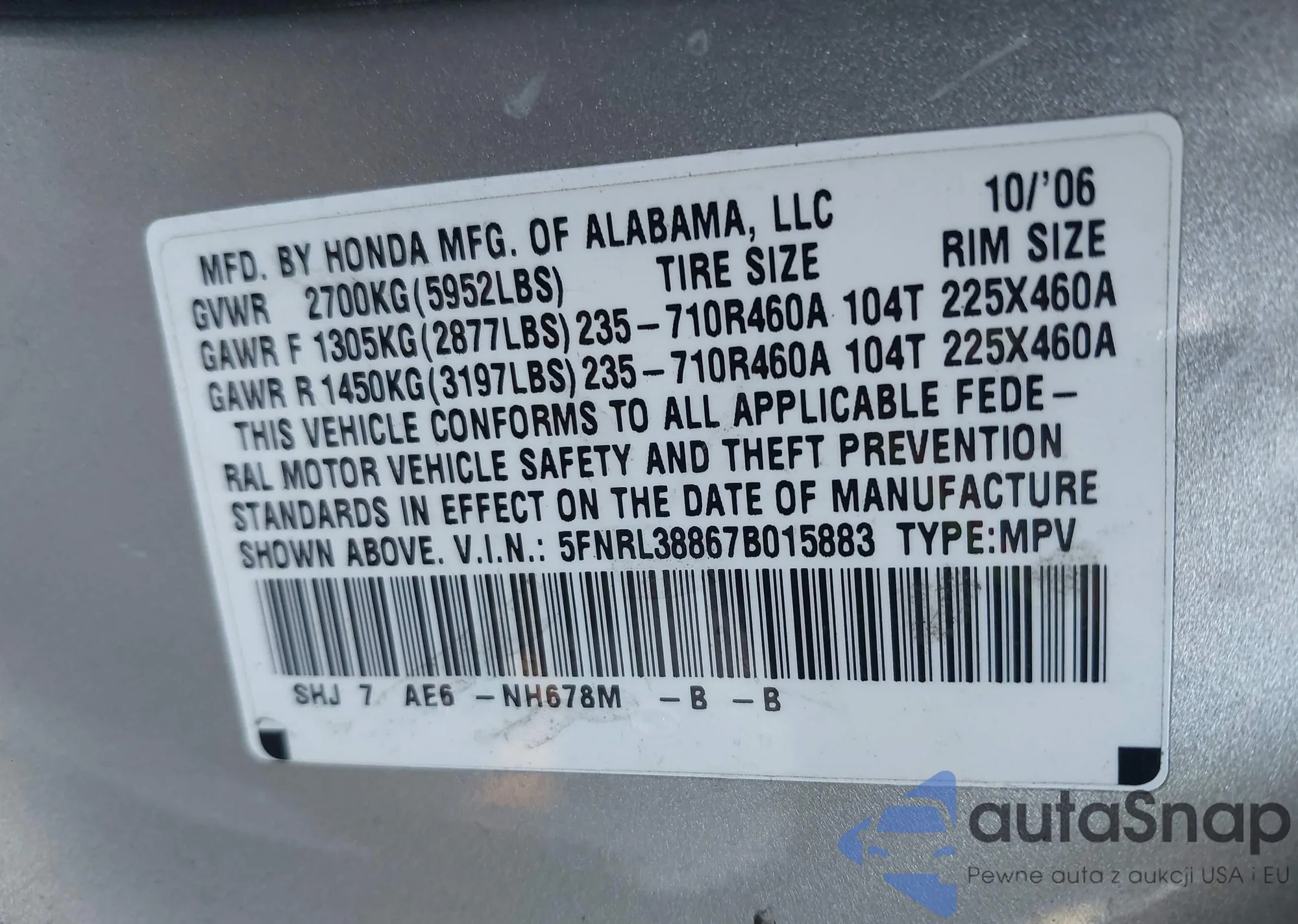 • VIN 5FNRL38867B015883