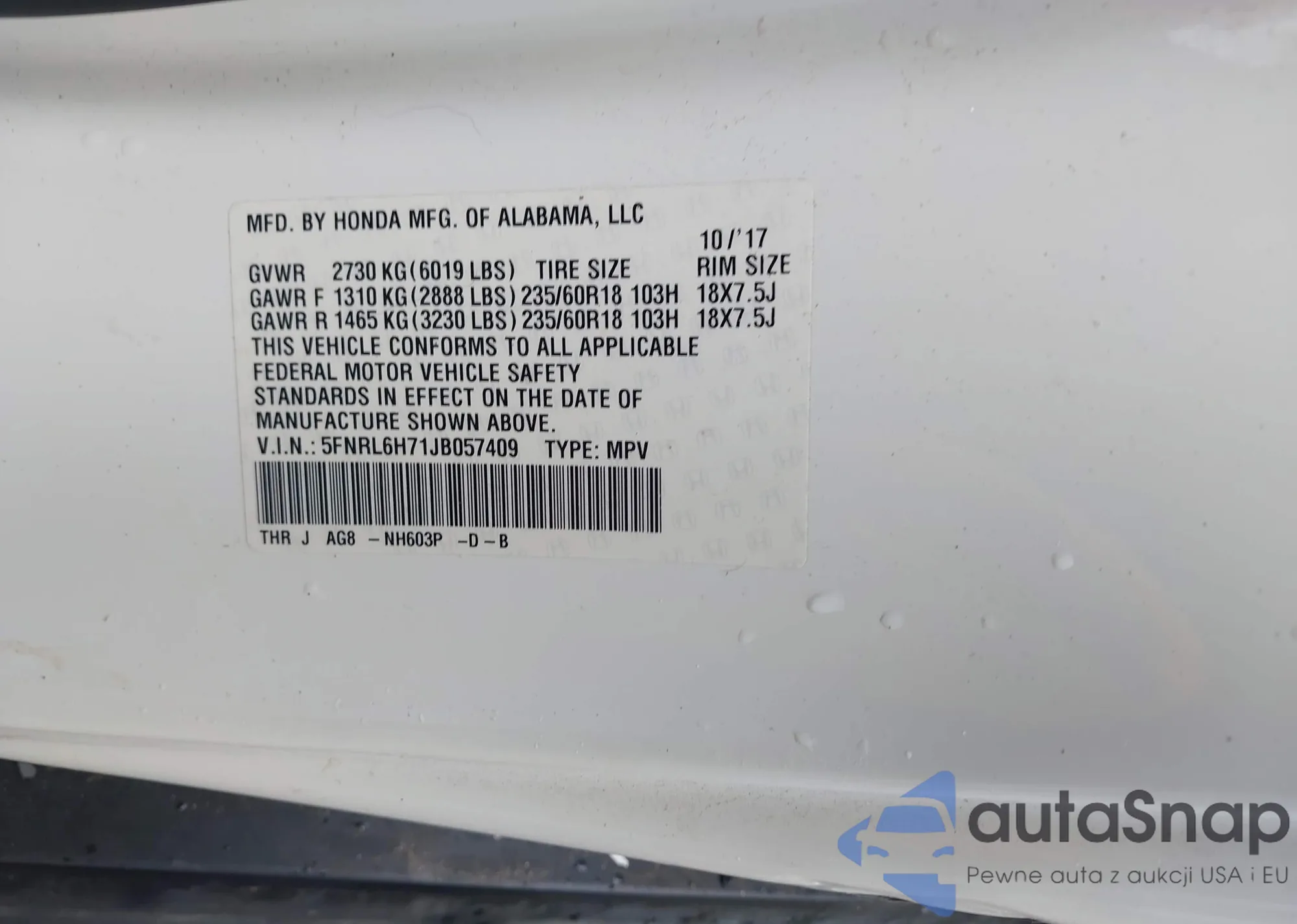 • VIN 5FNRL6H71JB057409