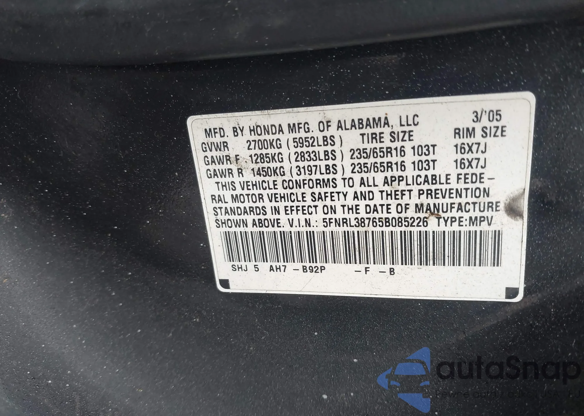 • VIN 5FNRL38765B085226