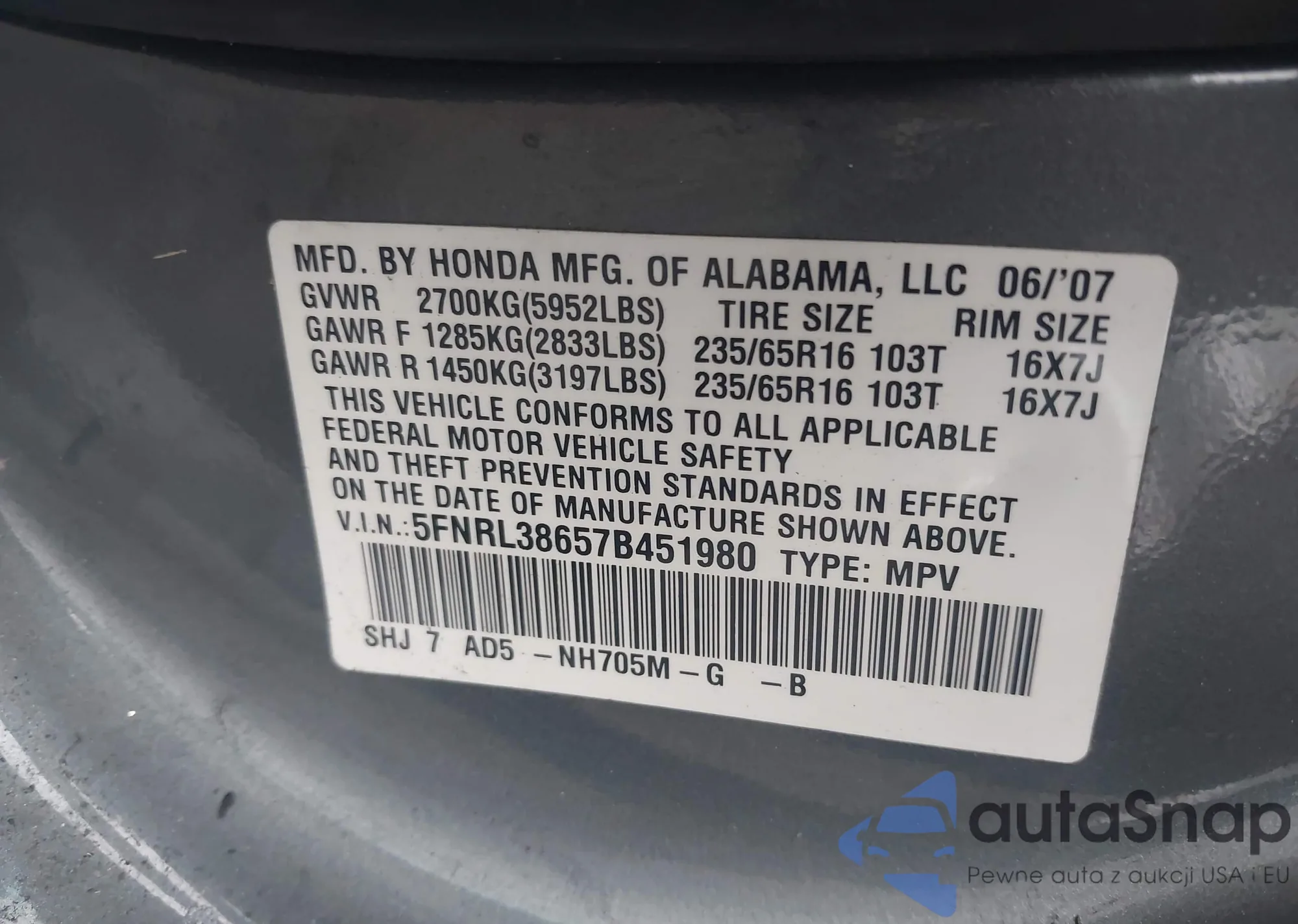 • VIN 5FNRL38657B451980